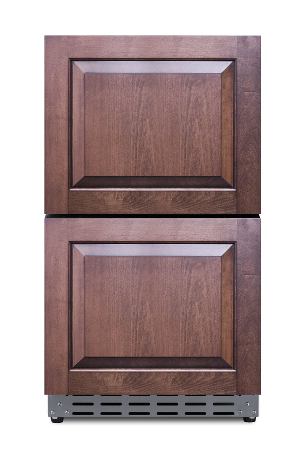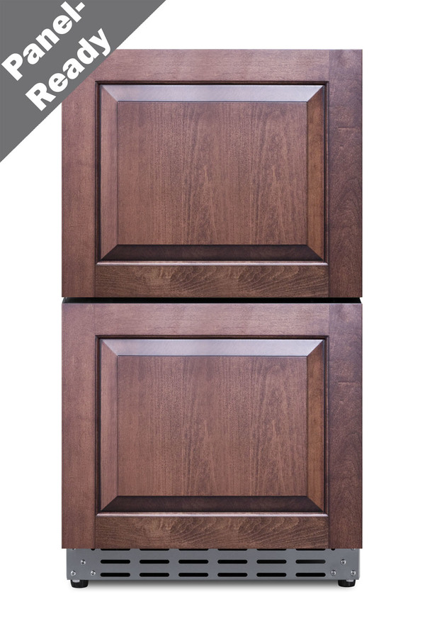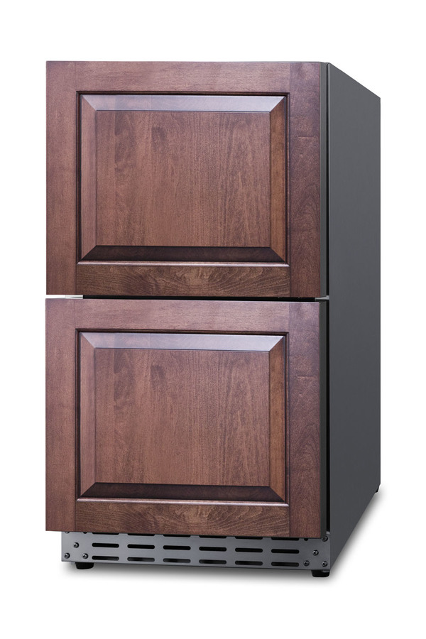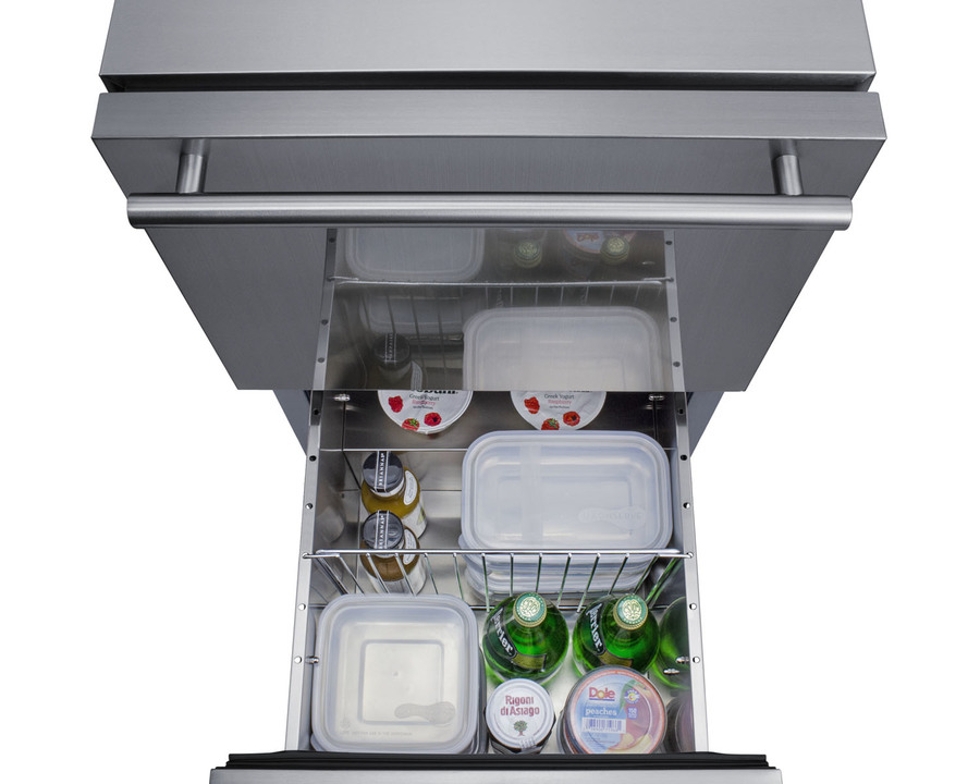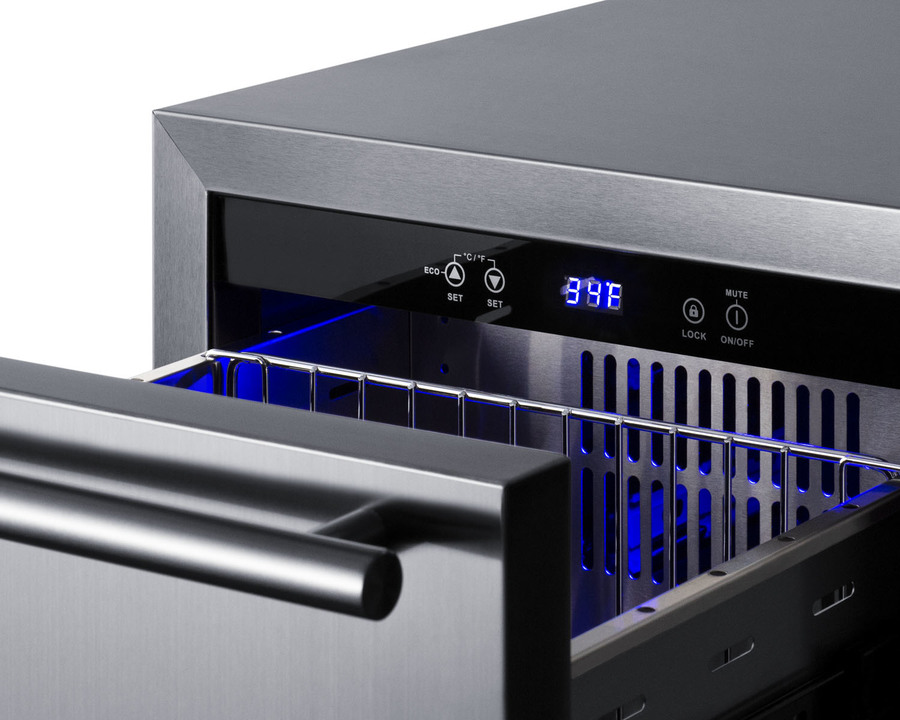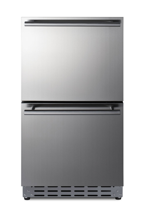 Summit manufactures the industry's largest selection of 18 inch wide refrigeration for under the counter, with a variety of versatile choices for indoor or outdoor kitchens. The ADRD18 is a two-drawer all-refrigerator sized just under 32 inches high for installation under lower ADA compliant counters. The front-breathing design and finished 304 grade stainless steel cabinet allow for built-in or freestanding use. Complete stainless steel construction inside and out offers durability in a professional look. Soft close glides allow you to gently close each drawer with a light touch. The drawers can also be customized with overlay panels to match or accent existing cabinetry design. The stainless steel kickplate and stylish handles complete the look. This unit features a right angle cord and sealed rear for added space spacings. Frost-free operation ensures minimum user maintenance inside the 3.4 cu ft. interior. Each drawer includes a divider to make it easier to separate and organize your storage, with attractive and efficient LED lighting to illuminate the interior. Intuitive digital controls display a temperature readout switchable from Fahrenheit to Celsius to best suit your preference. High/low temperature alarms audibly warn if the interior goes out of the recommended range. Additional features include an open drawer alarm, child lock to secure the controls, sabbath mode for optional observance, and eco-mode for energy savings. Model ADRD18 is ETL-S listed to NSF-7 commercial standards and also meets DOE guidelines for residential use. This unit is also approved for use in outdoor kitchens. Additional 18" wide options are available in front-opening styles as refrigerators, freezers, icemakers, beverage centers, and wine cellars. Browse the complete Summit lineup for more options.
