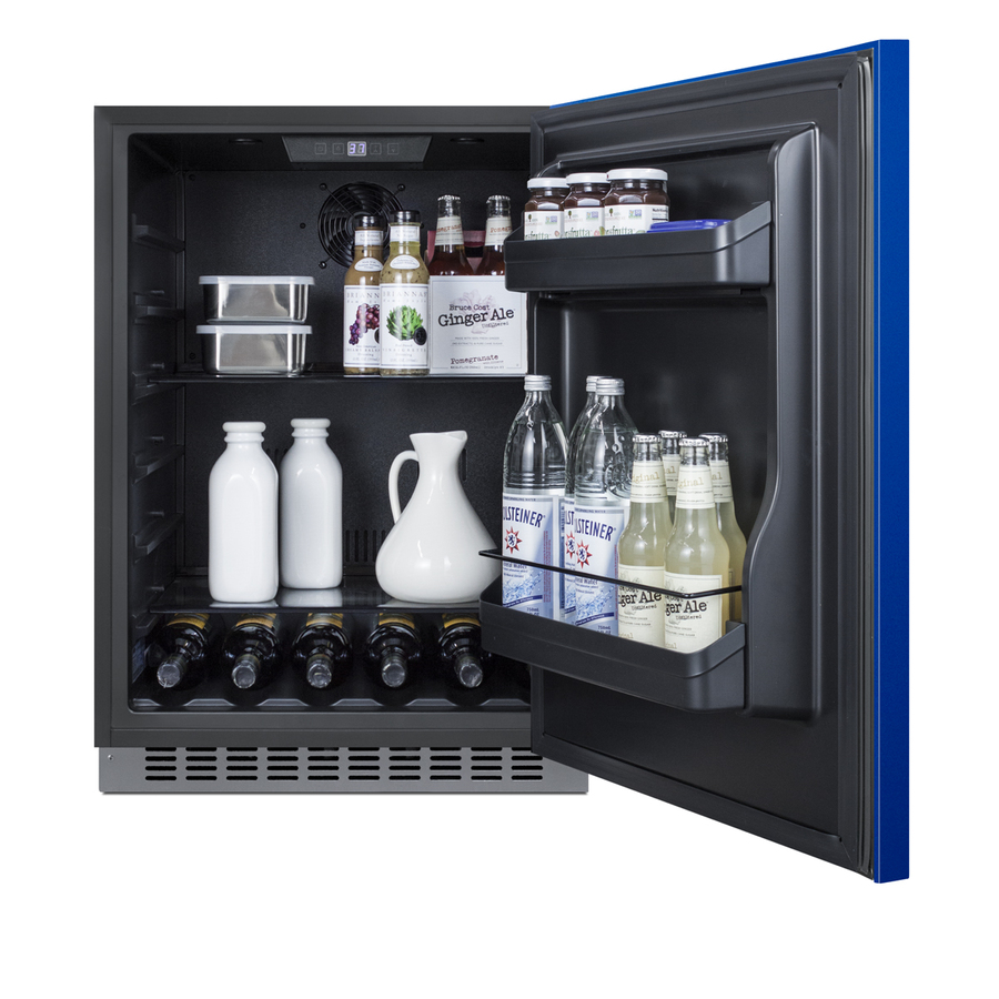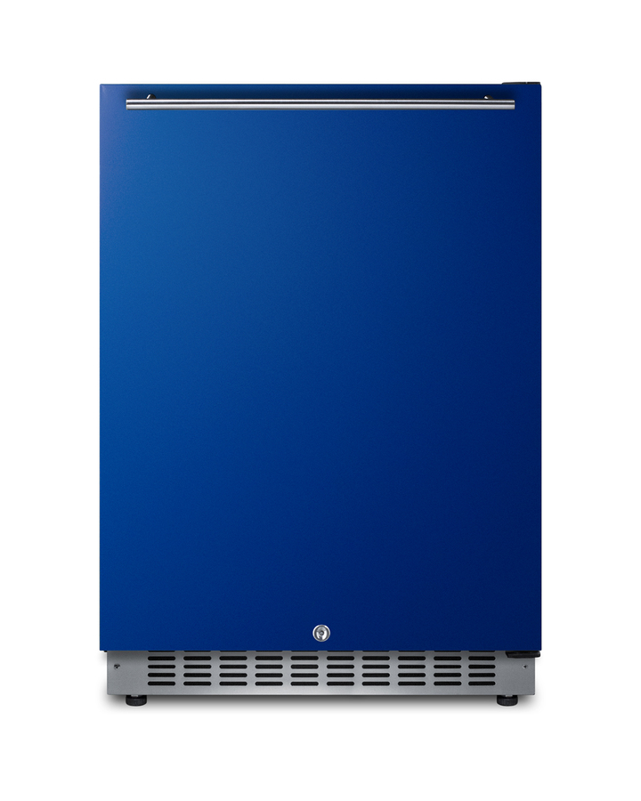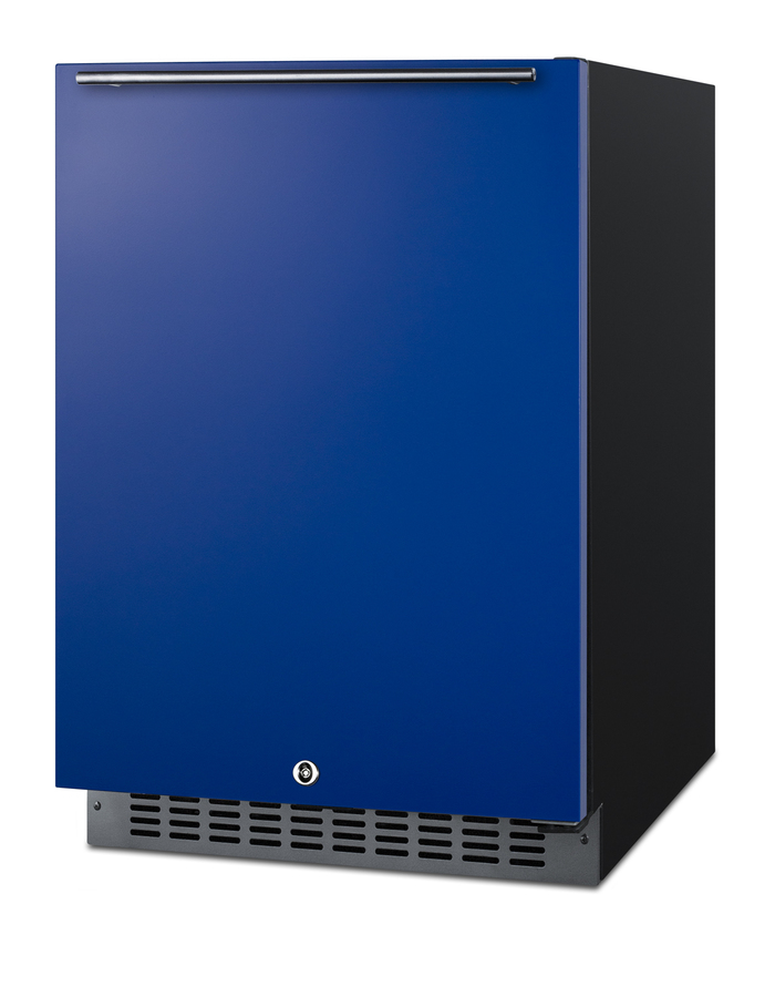 Make a statement under the counter with Summit's exclusive collection of boldly colored refrigerators and matching freezers. Model AL54B is a 24" wide refrigerator sized at just 32" high for easy installation under lower ADA compliant counters. The front-breathing cooling system allows built-in use, while the fully finished black cabinet also enables freestanding applications. The door finish comes in a striking cobalt blue, with a sleek horizontally mounted stainless steel handle and matching stainless steel kickplate to complete the unique look. Inside, the AL54B utilizes frost-free operation with fan-forced cooling to ensure low maintenance and even temperature distribution. Recessed LED lighting offers an attractive yet efficient look. The digital thermostat makes it easy to manage the interior temperature. This unit includes adjustable glass shelves for flexible, spill-proof storage and two large door racks ideal for keeping condiments in easy reach. The floor is specially slotted to hold bottles in place. An open door alarm and high temperature alarm audibly warn if stored items are being exposed. An optional Sabbath mode setting lets you disable some of the electrical elements during periods of observance. Additional features include a factory-installed lock for optional security, user-reversible door swing to best fit your space, right angle plug to save on depth, and sealed rear to ensure easier cleaning. The AL54B can be paired with the ALFZ53B frost-free freezer to create a matching undercounter ADA compliant set. Additional colors are available, including saffron gold, emerald green, and lavender. Browse the full Summit selection to find the perfect addition to your kitchen.