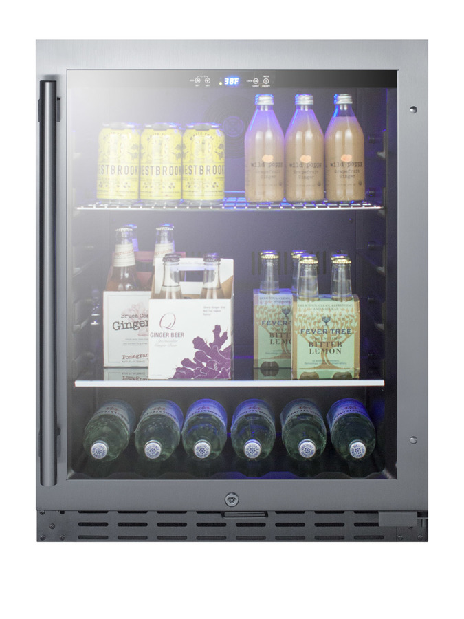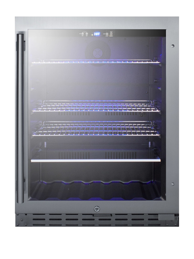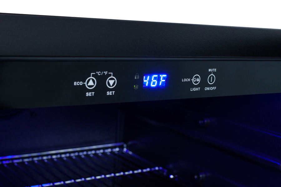 With a dual-purpose design, the ALBV2466 can serve as a beverage cooler or refrigerator offering unmatched versatility for residential or commercial use. The ALBV2466 is ETL-S listed to NSF-7 commercial standards and also meets residential standards. The front-breathing design allows built-in installation, while the fully finished black cabinet also enables freestanding use. Sized just under 32 inches high and 24 inches wide, this unit makes an ideal fit under lower ADA compliant counters. The user-reversible double pane tempered glass door features a seamless stainless steel door trim and pro style handle in stainless steel, while a stainless steel kickplate completes the look. A temperature alarm provides added security should the temperature go beyond the setpoint. The optional Sabbath Mode can be used to disable certain electrical features during periods of religious observance. The automatic defrost system keeps the unit running efficiently with little user maintenance. Inside, the ALBV2466 has a digital control panel which allows you to manage the unit’s temperature with ease. An adjustable temperature range between 34 and 65ºF allows for a variety of beverage storage options. Three pull-out wire shelves provide maximum storage capacity, while the fourth glass shelf allows for contents to be stood upright for added storage flexibility. The shelving brake system keeps the unit contents safe during loading and unloading, and the slotted floor ensures easy and safe storage of wine bottles. The soft LED lighting in a gentle blue hue offers an attractive and efficient presentation. With its advanced user features and versatile design, the ALBV2466 is an excellent addition to any ADA compliant setting looking for a beverage cooler with a modern, elegant look. This unit can be paired with the ALWC532 wine cellar for a matching set.