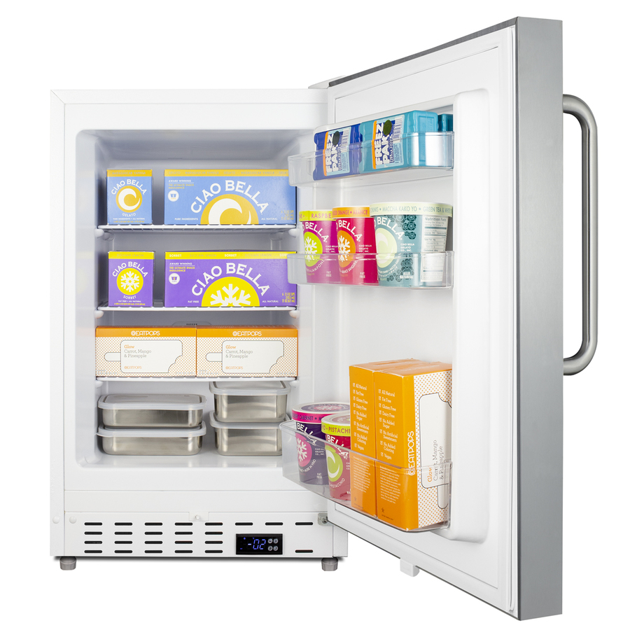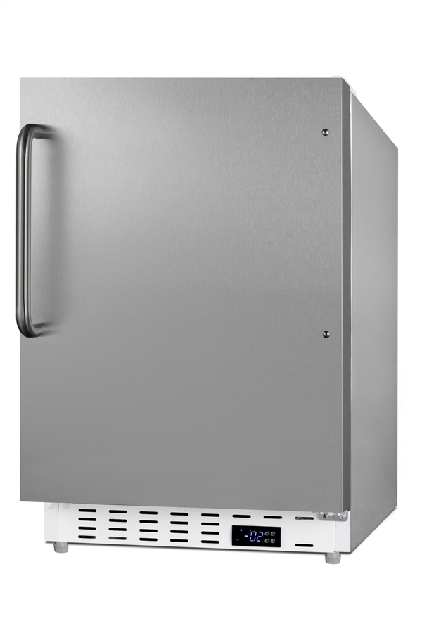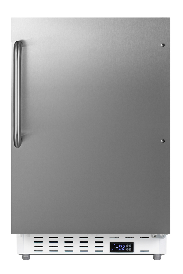 Summit Appliance offers a quality selection of 21" wide built-in undercounter all-freezers designed for installation under lower ADA compliant counters, with advanced features for user convenience. The ALFZ36CSS is sized at 32" high to fit under lower counters complying with ADA guidelines for accessibility. The fully finished stainless steel cabinet allows freestanding use, while the front-breathing system means this unit can be built-in with minimum clearance. The stainless steel, user-reversible door is 3" thick for efficient insulation, with a curved towel bar handle included for added convenience. This unit comes with a right angle cord to allow for easier placement without added depth. A digital thermostat, located in the kickplate, makes for easy temperature management with a readout in Fahrenheit or Celsius. Inside, the ALFZ36CSS features an all-white interior for easy cleaning and viewing of contents. Static manual defrost operation provides efficient cooling inside the 2.68 cu.ft. interior. Three adjustable wire shelves offer optimal storage options for large and small items, while three removable door racks accommodate additional storage as needed. The user-set high and low temperature alarms provide added security should the temperature go beyond the setpoint, while the open door alarm sounds if the door is ajar over one minute for added peace-of-mind. These alarms can be disabled depending on your needs. Sized at just 21" wide, the ALFZ36CSS is the perfect addition for space-challenged spaces seeking dependable freezer options in a durable design. For a complete set, pair this unit with the matching ALR46WCSS all-refrigerator. Additional choices are available in stainless steel and panel-ready exterior finishes.