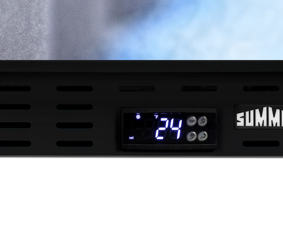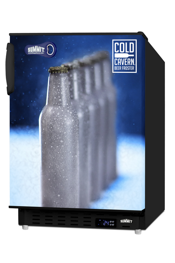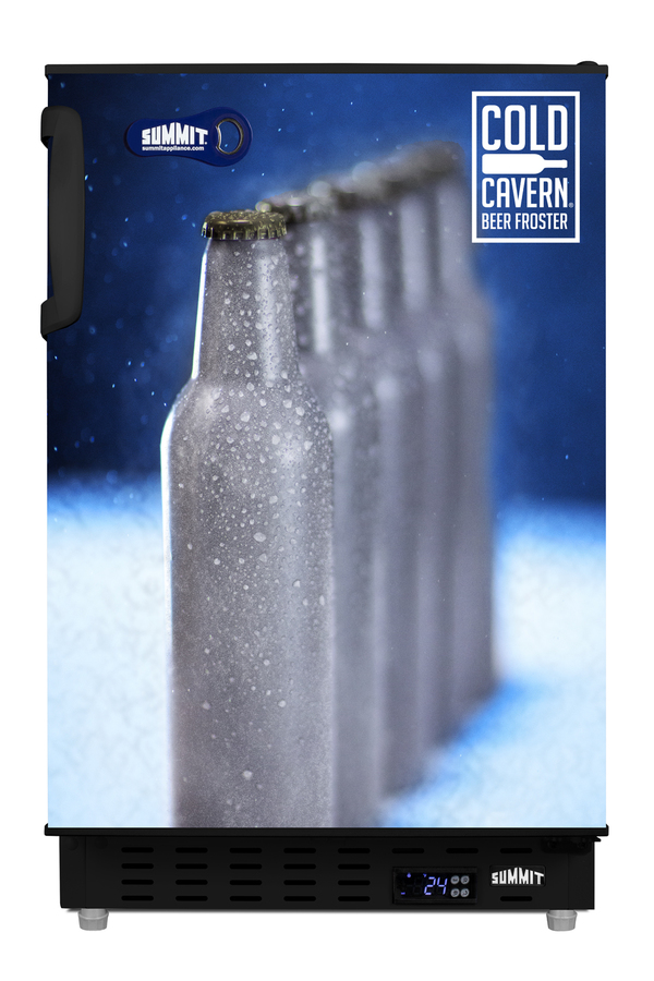 Enjoy ice cold beer in style with SUMMIT's Cold Cavern series of unique beer frosters. At 32" tall, the ALFZ37BFROST is an ADA compliant all-freezer specially designed to store aluminum bottles and cans at an arctic 24°F, the perfect temperature for certain lighter domestic brews. At this temperature, your bottle will actually frost, offering a deliciously crisp drinking experience. The ALFZ37BFROST has a fully finished textured black cabinet with our exclusive Cold Cavern decal decorating the front. The user-reversible door is 3" thick for efficient insulation, with a handle included for added convenience. A digital thermostat, located in the kickplate, is installed for precise temperature management, with an external readout in Fahrenheit or Celsius. This unit comes with a right angle cord to allow for easier placement without added depth. A bottle opener magnet is included for user convenience. Inside, the ALFZ37BFROST features an all-white interior for easy cleaning and viewing of contents. Static manual defrost operation provides efficient cooling inside the 2.68 cu.ft. interior. Three adjustable wire shelves offer optimal storage options for bottles, while three removable door racks accommodate additional can storage as needed. Additional features include high/low temperature alarms and an open door alarm for added peace-of-mind. These alarms can be disabled depending on your needs. At just 20" wide, the ALFZ37BFROST is designed for freestanding or built-in use, and is the perfect addition for any home bar, mancave, or similar space seeking dependable beer storage in a durable design.