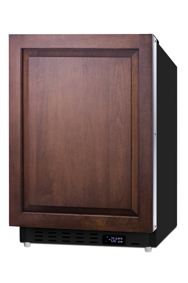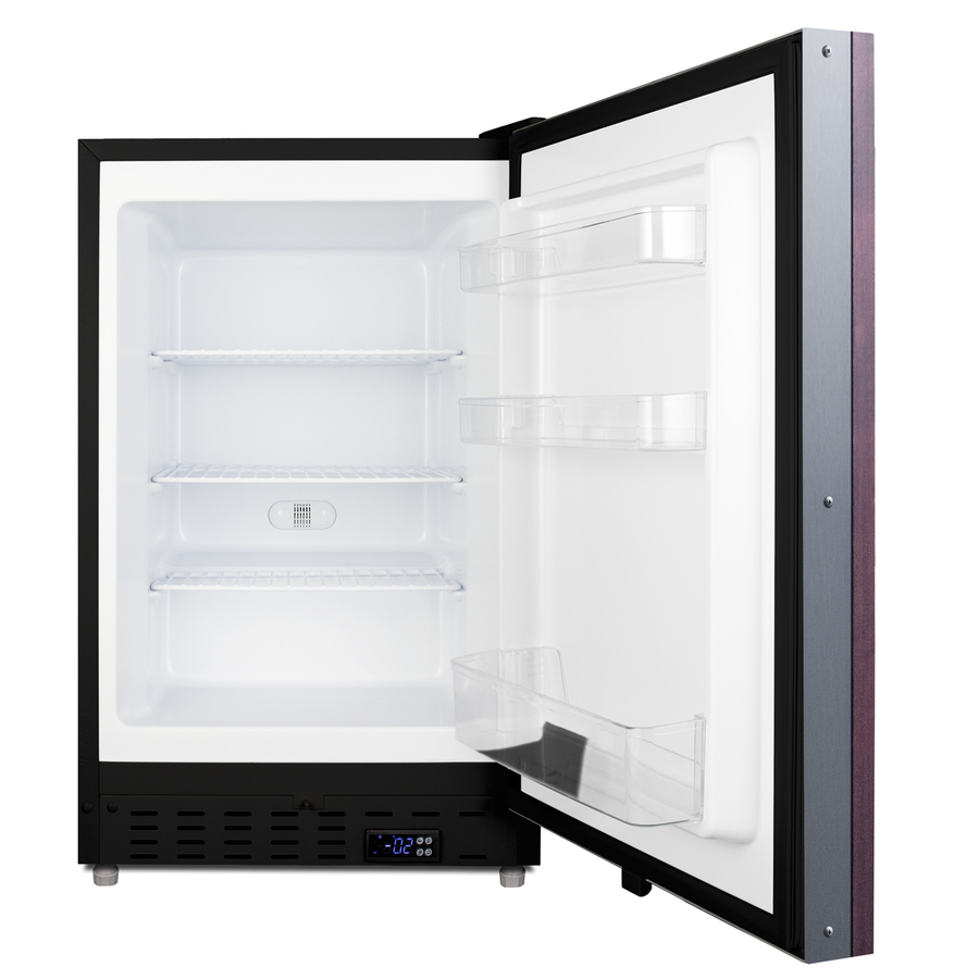 Summit Appliance offers a quality selection of 21" wide built-in undercounter all-freezers designed for installation under lower ADA compliant counters, with advanced features for user convenience. The ALFZ37BIF is sized at 32" high to fit under lower counters complying with ADA guidelines for accessibility. The fully finished textured black cabinet allows freestanding use, while the front-breathing system means this unit can be built-in with minimum clearance. The door is 3" thick for efficient insulation and features an integrated stainless steel frame designed to accept full panel overlays, allowing users to seamlessly blend the unit into their own cabinetry design (panel size: 19 13/16" W x 27 1/8" H). This unit comes with a right angle cord to allow for easier placement without added depth. A digital thermostat, located in the kickplate, makes for easy temperature management with a readout in Fahrenheit or Celsius. Inside, the ALFZ37BIF features an all-white interior for easy cleaning and viewing of contents. Static manual defrost operation provides efficient cooling inside the 2.68 cu.ft. interior. Three adjustable wire shelves offer optimal storage options for large and small items, while three removable door racks accommodate additional storage as needed. The user-set high and low temperature alarms provide added security should the temperature go beyond the setpoint, while the open door alarm sounds if the door is ajar over one minute for added peace-of-mind. These alarms can be disabled depending on your needs. Sized at just 21" wide, the ALFZ37BIF is the perfect addition for space-challenged spaces seeking dependable freezer options in a durable design. For a complete set, pair this unit with the matching ALR47BIF all-refrigerator. Additional choices are available in complete stainless steel and black cabinet finishes.