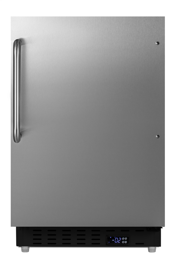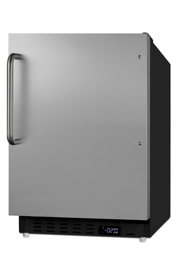 Summit Appliance offers a quality selection of 21" wide built-in undercounter all-freezers designed for installation under lower ADA compliant counters, with advanced features for user convenience. The ALFZ37BSSTB is sized at 32" high to fit under lower counters complying with ADA guidelines for accessibility. The fully finished textured black cabinet allows freestanding use, while the front-breathing system means this unit can be built-in with minimum clearance. The stainless steel, user-reversible door is 3" thick for efficient insulation, with a curved towel bar handle included for added convenience. This unit comes with a right angle cord to allow for easier placement without added depth. A digital thermostat, located in the kickplate, makes for easy temperature management with a readout in Fahrenheit or Celsius. Inside, the ALFZ37BSSTB features an all-white interior for easy cleaning and viewing of contents. Static manual defrost operation provides efficient cooling inside the 2.68 cu.ft. interior. Three adjustable wire shelves offer optimal storage options for large and small items, while three removable door racks accommodate additional storage as needed. The user-set high and low temperature alarms provide added security should the temperature go beyond the setpoint, while the open door alarm sounds if the door is ajar over one minute for added peace-of-mind. These alarms can be disabled depending on your needs. Sized at just 21" wide, the ALFZ37B is the perfect addition for space-challenged spaces seeking dependable freezer options in a durable design. For a complete set, pair this unit with the matching ALR47BSSTB all-refrigerator. Additional choices are available with a stainless steel cabinet and panel-ready exterior finishes.