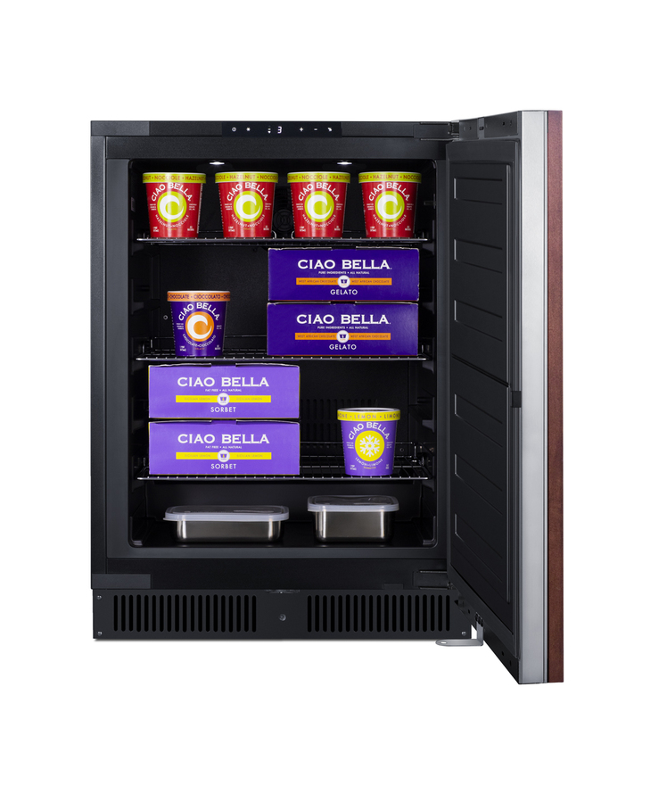 Summit manufactures the industry's largest selection of built-in appliances sized for use under lower ADA compliant counters, including frost-free freezers specially designed to match our popular ADA compliant refrigerators. Model ALFZ53IF is a 24" wide all-freezer that can be paired with our AL54PNR all-refrigerator. Sized at just 32" high, it can easily be installed under an ADA compliant counter. The fully finished black cabinet allows freestanding use, while the front-breathing system also allows this unit to be built-in with minimum clearance. The reversible stainless steel door features a European-style fully articulating hinge for zero clearance opening. We include a 2-piece bracket kit that allows easy installation of overlay panels to create a custom look that can seamlessly blend into your existing cabinetry design (panel size: 28.38" H x 23.4" W; maximum weight: 10 lbs.). This unit has a flush back for easy cleaning and a right angle plug for a better fit. A factory-installed lock is located in the kickplate. Inside, the ALFZ53IF utilizes frost-free operation with fan-forced cooling to ensure low maintenance and even temperature distribution. Recessed LED lighting offers an attractive yet efficient look inside the black interior. Three adjustable chrome shelves can be set at five different positions to best accommodate your storage needs. Additional user-friendly features include an open door alarm, high temperature alarm, and Sabbath mode setting that lets you disable some of the electrical elements during periods of observance. This unit features intuitive digital controls for easy temperature management. With its deluxe style and user-friendly features, this unit is the perfect choice for ADA compliant kitchens. It's a perfect match for our AL54PNR all-refrigerator, both panel-ready to create a truly custom refrigerator/freezer set under ADA compliant counters. Additional door finishes are available, including stainless and black stainless steel, and our new vibrant colors. Browse the full selection to explore your options.