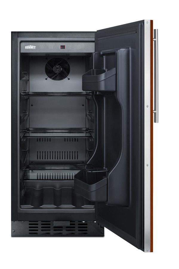 Summit offers the industry's largest selection of 32" high ADA compliant appliances, with quality choices for built-in or freestanding use in 15" wide spaces. The ALR15BIF is a 2.2 cu.ft. all-refrigerator with a front-breathing system for built-in use. The door features an integrated stainless steel frame designed to accept custom overlay panels, allowing you to match your refrigerator to your cabinetry for a customized look (panel size: 27 3/8" H x 14 11/16" W). This unit has a black cabinet and sealed back for easier cleanup. At just under 32" high, it's perfect for fitting under lower counters following ADA guidelines. Inside, the ALR15BIF features a jet black finish and convenient frost-free operation for minimum maintenance. Fan-forced cooling helps to stabilize the temperature inside. Adjustable glass shelves offer spill-proof storage and two door racks are ideal for keeping condiments and bottles within reach. This unit comes with a digital control panel for easy temperature management, with a temperature readout viewable in Celsius and Fahrenheit. Additional features include an open door and high temperature alarm, temperature memory function, and Sabbath mode to allow users to disable certain electrical functions during periods of observance. Recessed LED lighting offers an attractive, energy efficient view. The ALR15BIF is approved for both residential and commercial use, and is ETL-S listed to NSF-7 commercial standards. Additional choices for 15" wide spaces, as well as ADA compliant applications, can be found in Summit's extensive product catalog. Browse our website for more options.