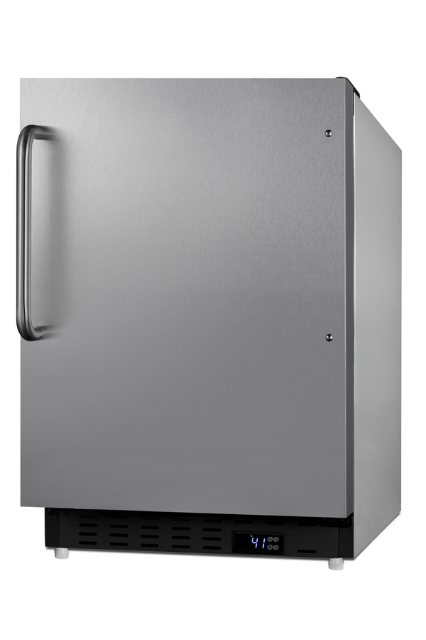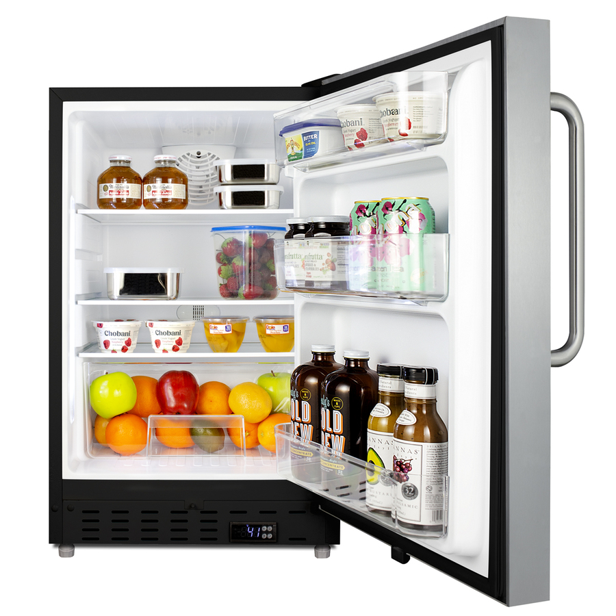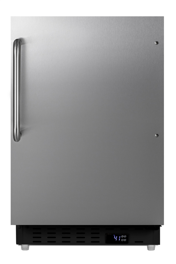 Summit Appliance offers a quality selection of 21" wide built-in undercounter all-refrigerators designed for installation under lower ADA compliant counters, with advanced features for user convenience. The ALR47BCSS is sized at 32" high to fit under lower counters complying with ADA guidelines for accessibility. The fully finished stainless steel cabinet allows freestanding use, while the front-breathing system means this unit can be built-in with minimum clearance. The user-reversible, stainless steel, door is 3" thick for efficient insulation, with a curved towel bar handle included for added convenience. This unit comes with a right angle cord to allow for easier placement without added depth. A digital thermostat, located in the kickplate, makes for easy temperature management with a readout in Fahrenheit or Celsius. Inside, the ALR47BCSS features an all-white interior for easy cleaning and viewing of contents. An LED light located toward the front of the unit attractively illuminates the interior when the door opens. Automatic defrost operation ensures minimal user maintenance, with an internal fan to help ensure even cooling throughout the 3.53 cu.ft. interior. Three adjustable glass shelves offer optimal storage options for large and small items, while a pull-out crisper drawer provides storage for fruits and vegetables. Three removable door racks accommodate additional storage as needed. The user-set high and low-temperature alarms provide added security should the temperature go beyond the setpoint, while the open door alarm sounds if the door is ajar over one minute for added peace-of-mind. These alarms can be disabled depending on your needs. Sized at just 21" wide, the ALR47BCSS is the perfect addition for space-challenged environments seeking dependable freezer options in a durable design. For a complete set, pair this unit with the matching ALFZ37BCSS all-freezer. Additional choices with a black cabinet and panel-ready styles are available.