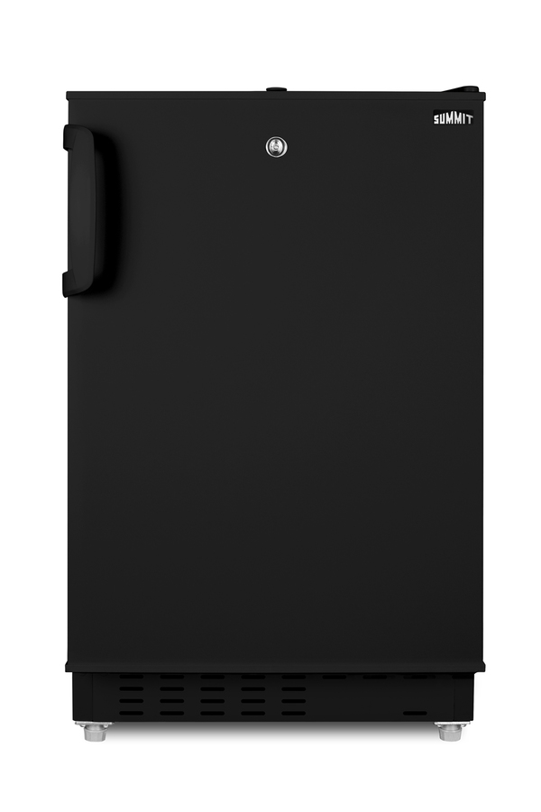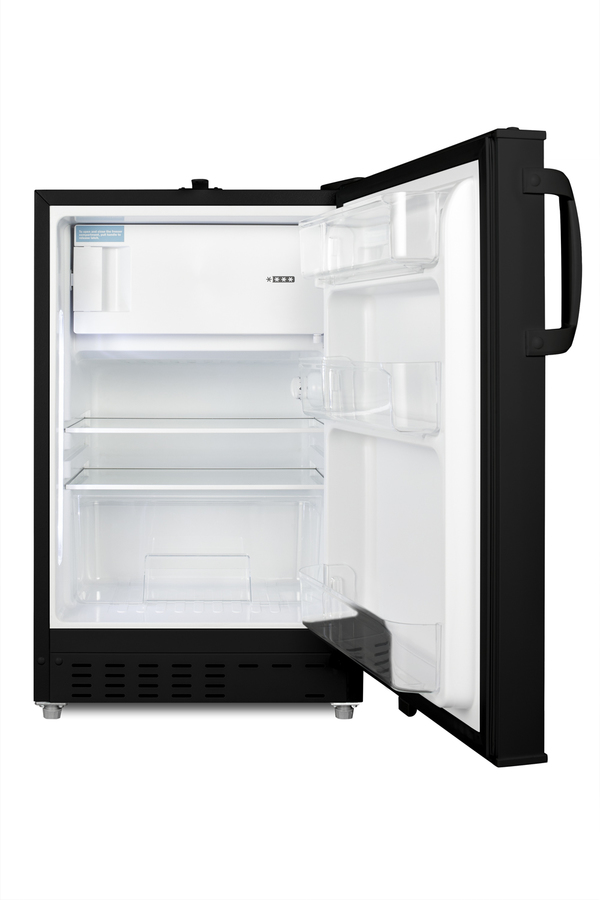 Summit Appliance offers a wide range of built-in undercounter refrigerator-freezers designed for installation under lower ADA compliant counters, with advanced features for user convenience. The ALRF49B is sized at 32" high to fit under lower counters complying with ADA guidelines for accessibility. The fully finished textured black cabinet allows freestanding use, while the front-breathing system means this unit can be built-in with minimum clearance. The user-reversible door is 3" thick for efficient insulation, with a handle included for added convenience. This unit comes with a right angle cord to allow for easier placement without added depth. A factory-installed lock is conveniently located towards the top of the door to provide security as needed. Inside, the ALRF49B features an all-white interior for easy cleaning and viewing of contents. Static manual defrost operation provides efficient cooling inside the 2.68 cu.ft. interior, while the dial thermostat makes temperature management simple. An automatic LED light located toward the front of the unit attractively illuminates the interior when the door opens. Three spill-proof adjustable glass shelves offer flexible storage options for large and small items, while a pull-out crisper drawer provides storage for fruits and vegetables. Three removable door racks accommodate additional storage as needed. This unit includes a compact freezer compartment with a cover. With its compact size and convenient features, the ALRF49B is the perfect unit for offices, dormitories, and other residential settings in need of an easy-fitting refrigerator-freezer.