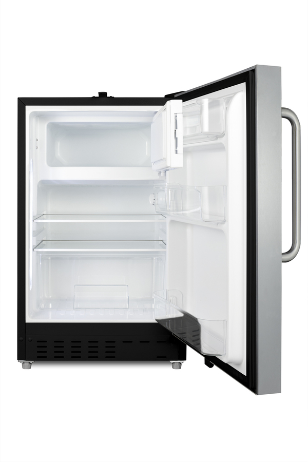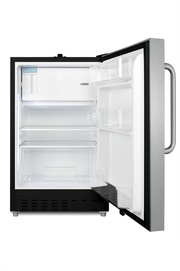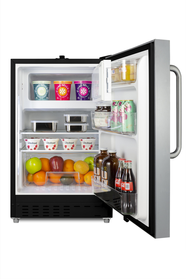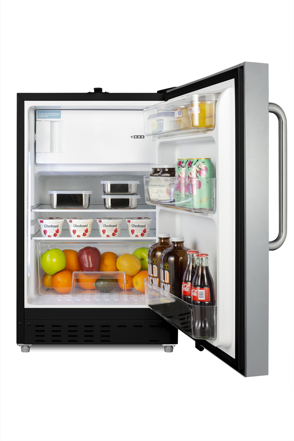 Summit Appliance offers a wide range of built-in undercounter refrigerator-freezers designed for installation under lower ADA compliant counters, with advanced features for user convenience. The ALRF49BSSTB is sized at 32" high to fit under lower counters complying with ADA guidelines for accessibility. The fully finished textured black cabinet allows freestanding use, while the front-breathing system means this unit can be built-in with minimum clearance. The stainless steel, user-reversible door is 3" thick for efficient insulation, with a curved towel bar handle included for added convenience. This unit comes with a right angle cord to allow for easier placement without added depth. A factory-installed lock is conveniently located towards the top of the door to provide security as needed. Inside, the ALRF49BSSTB features an all-white interior for easy cleaning and viewing of contents. Static manual defrost operation provides efficient cooling inside the 2.68 cu.ft. interior, while the dial thermostat makes temperature management simple. An automatic LED light located toward the front of the unit attractively illuminates the interior when the door opens. Three spill-proof adjustable glass shelves offer flexible storage options for large and small items, while a pull-out crisper drawer provides storage for fruits and vegetables. Three removable door racks accommodate additional storage as needed. This unit includes a compact freezer compartment with a cover. With its compact size and convenient features, the ALRF49BSSTB is the perfect unit for offices, dormitories, and other residential settings in need of an easy-fitting refrigerator-freezer.