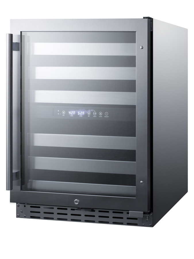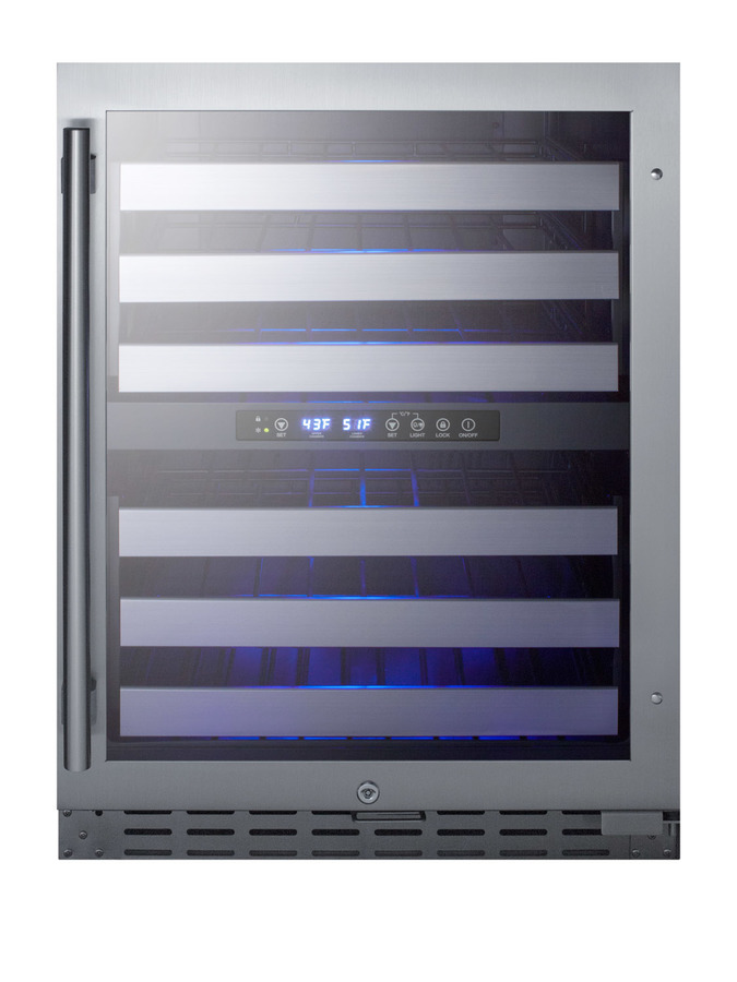 Summit's extensive selection of built-in undercounter wine cellars includes ADA compliant choices with versatile designs for residential or commercial use. The ALWC532CSS is a dual zone wine cellar that is ETL-S listed to NSF-7 commercial standards. The front-breathing design allows built-in installation, while the fully finished stainless steel wrapped cabinet also enables freestanding use. Sized just under 32 inches high and 24 inches wide, this unit makes an ideal fit under lower ADA compliant counters. The user-reversible double pane tempered glass door features a seamless stainless steel door trim and pro style handle in stainless steel. A factory-installed lock offers added security and a stainless steel kickplate completes the look. Inside, the ALWC532CSS is designed to store up to 46 standard Bordeaux style bottles, or a combination of 30 Bordeaux and 16 wider Burgundy bottles. The digital control panel allows you to manage the upper temperature chamber between 41 and 50ºF for white wine, while the lower zone is designed to store red wine between 50 and 64ºF. Six full-extension black wire shelves with stainless steel front trim move out smoothly on ball-bearing glides for easy loading. Both compartments include recessed LED lighting in a gentle blue hue for an attractive and efficient presentation. With its advanced user features and versatile design, the ALWC532CSS makes a great addition to any ADA compliant setting looking to store wine in modern style. This unit can be paired with the ALBV2466CSS for a matching set.