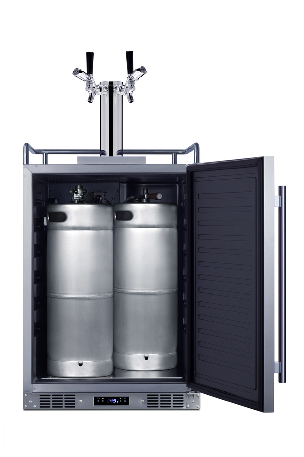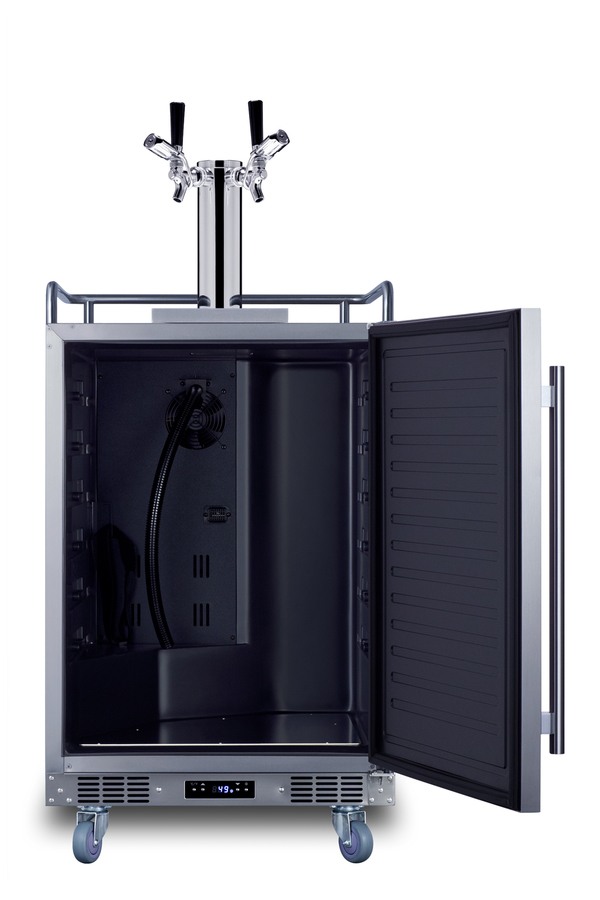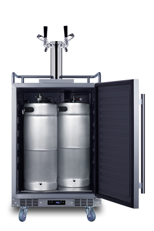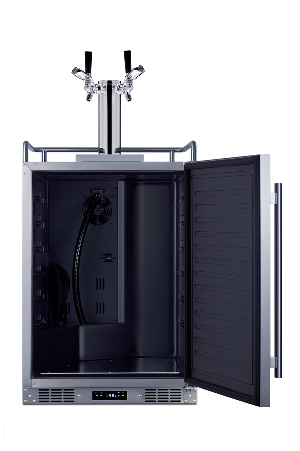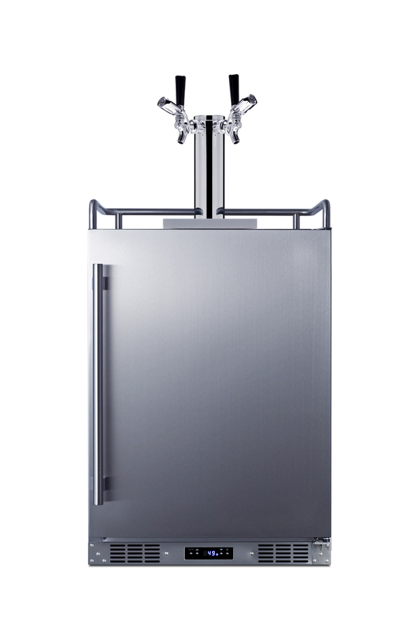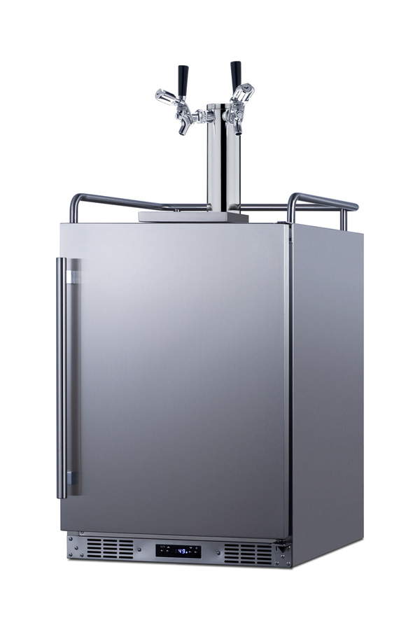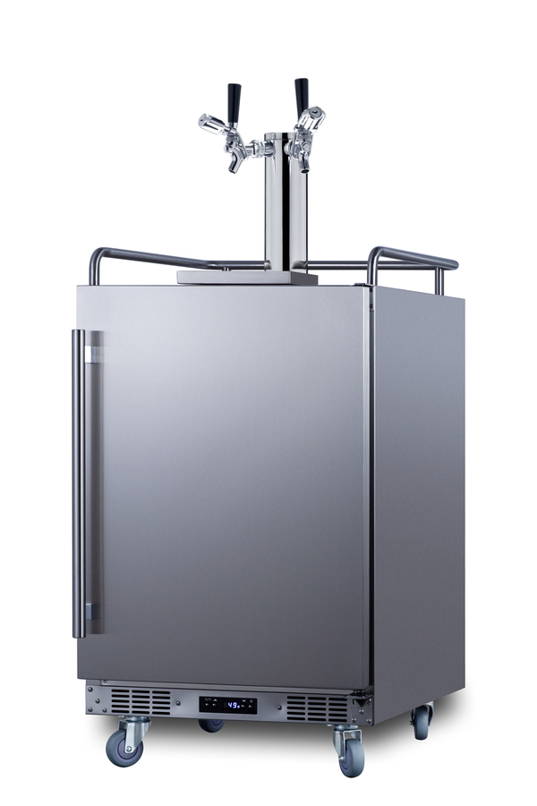 Summit manufactures a complete line of built-in kegerators designed for indoor/outdoor use in commercial settings. The BC74OSCOMTWIN is a full-size kegerator designed for dispensing beer on tap. It is ETL-S listed to NSF-7 and meets UL-471 standards for use in commercial establishments. Sized at just 24" wide, it features a weatherproof 304 grade exterior for long-lasting durability safe for use in outdoor settings. The front-breathing system allows built-in installation, while the fully finished cabinet and included caster set make for easy freestanding, portable use. This unit features a user-reversible stainless steel door with a pro style vertically mounted handle. The sealed back allows for easy cleaning of the unit. Additional features include a removable two-piece stainless steel drip tray to collect spills and a chrome guard rail to help keep glasses and mugs in place. For added security, we include Summit's TapLock, a removable lock that allows you to secure the tap faucet as needed to prevent unsupervised access to the kegerator contents. Inside, the 5.6 cu.ft. interior can accommodate a full half or slim quarter keg, or up to three Cornelius or sixth barrel kegs. We include a complete commercial grade dual tap kit for dispensing your favorite beer, including a Sankey tap system and twin tap draft tower, along with a CO2 tank and regulator. A tap cool system keeps your beer cold as it goes through your tower, and a Velcro strap holds the CO2 tank in place. The interior floor is made from stainless steel to add protection when loading and removing kegs. Two chrome shelves, with six placement options, allow the kegerator to also function as a beverage refrigerator. A digital thermostat makes it easy to manage the wide range temperature, while the external digital display has a readout in Celsius or Fahrenheit. Automatic defrost operation ensures minimal user maintenance. The Memory IC function recovers the unit's last settings in the case of a power outage or disruption. With its solid construction, user-friendly features, and attractive design, the BC74OSCOMTWIN is the perfect beer dispenser for indoor or outdoor commercial settings. Additional choices are available with alternate tapping options, including choices to dispense wine and coffee. Browse the full Summit line to explore all of your options.