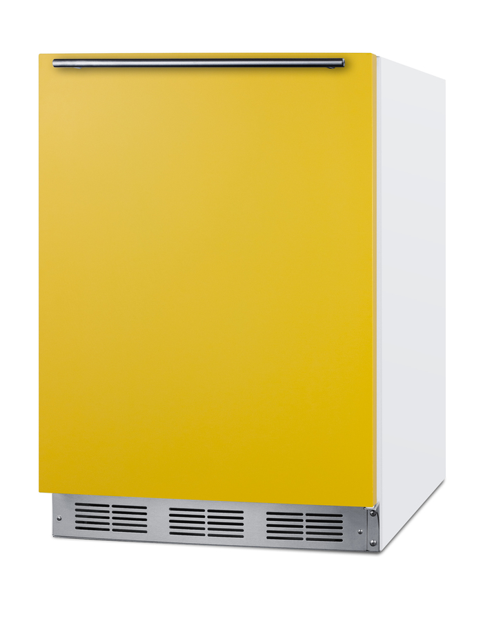 Make a statement under the counter with Summit's exclusive European collection of boldly colored refrigerators, available in standard or ADA compliant height. Model BRF611WHYADA is a 24" wide refrigerator-freezer sized at just 32" high for use in ADA compliant settings, with a generous capacity of more than 5 cu.ft. to meet general storage needs. The door comes in a bright saffron gold hue, with a sleek horizontally mounted stainless steel handle and matching stainless steel kickplate to complete the unique look. This unit has a white exterior cabinet. It is manufactured in Europe and modified in the United States with domestic steel finishing. Inside, the BRF611WHYADA features a dual evaporator to allow separated cooling of the fresh and frozen food sections. The refrigerated compartment utilizes low maintenance automatic defrost, while the interior freezer compartment is manual defrost to achieve lower storage temperatures ideal for ice cream and other frozen food. The deluxe interior includes adjustable glass shelves for spill-proof storage and easier cleaning, as well as a scalloped wine shelf to hold wine and champagne bottles safely in place. Door racks offer additional convenience for tall bottles and condiments and a clear crisper drawer ensures your produce is stored under the ideal conditions. This model includes automatic interior lighting and an adjustable dial thermostat. Additional colors are available, including emerald green, cobalt blue, and lavender. Browse the full Summit selection to find the perfect addition to your kitchen.