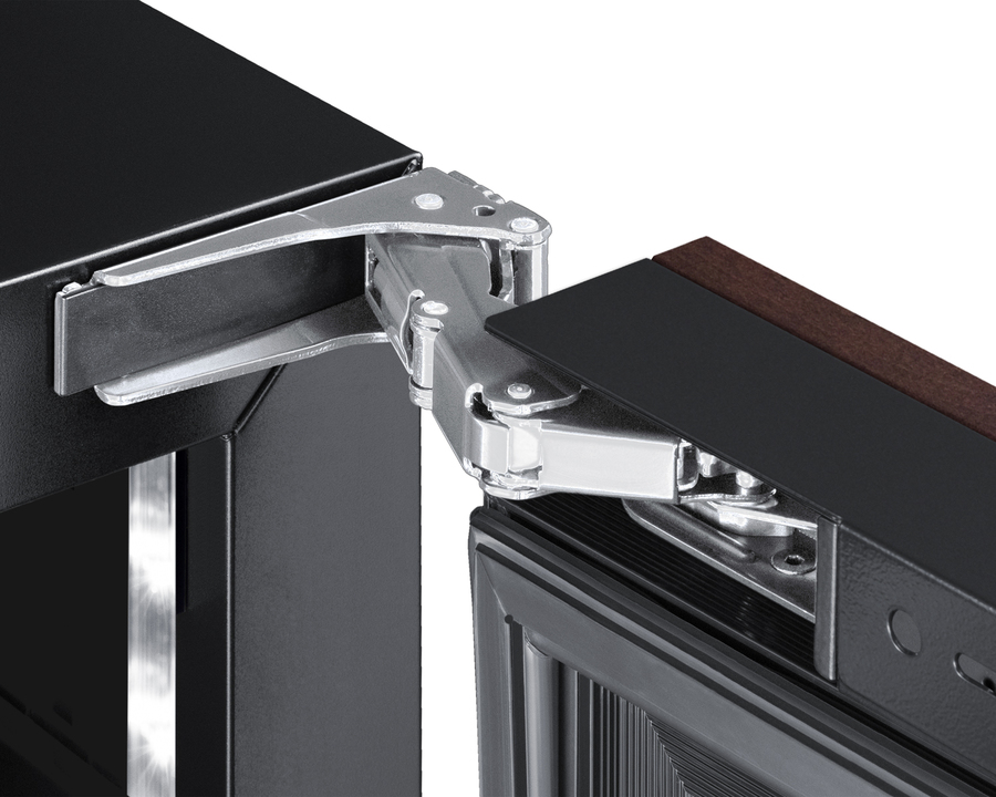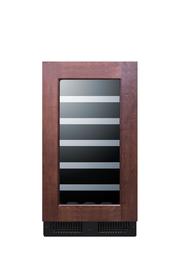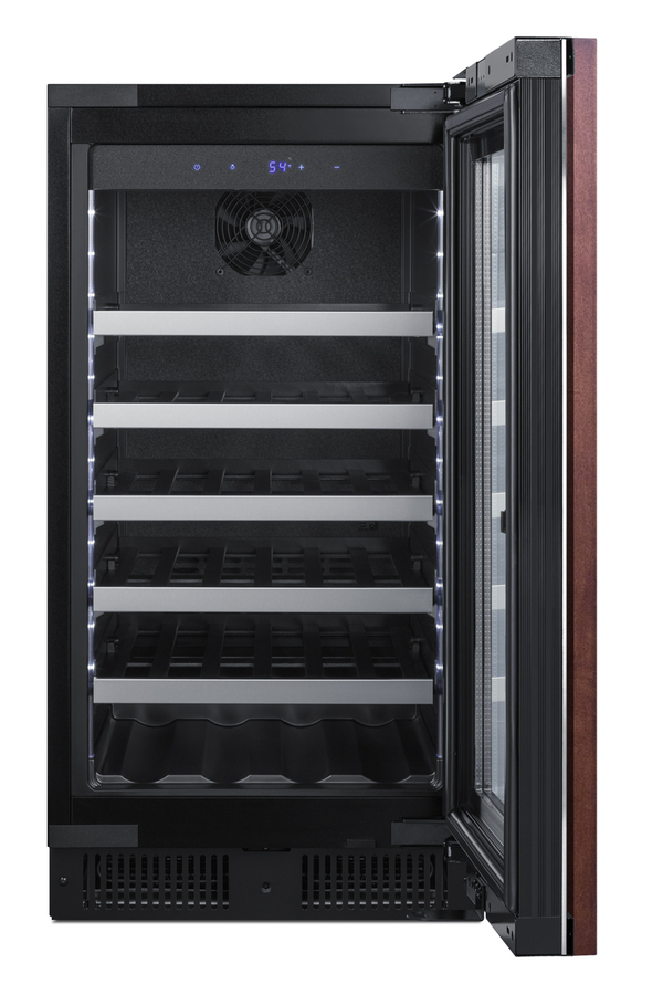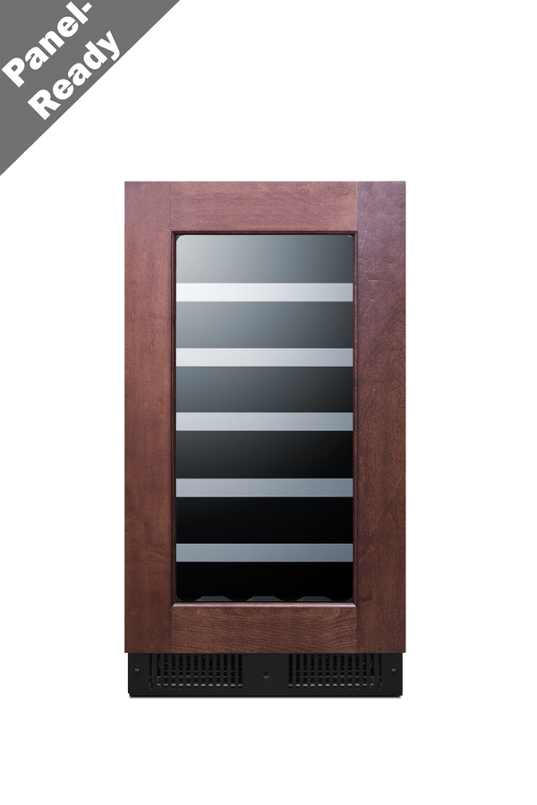Summit manufactures deluxe undercounter appliances designed to bring modern luxury into the home. The CL18WCPNR is an 18" wide single zone wine cellar. The front breathing design allows built-in installation under counters, while the fully finished cabinet in a jet black finish also enables freestanding use. This unit includes a fully articulating European-style hinge and 2-piece bracket kit that lets you easily install overlay panels over the door trim to create a custom look. Inside, white LED lighting located on the side walls complements the black interior to provide an attractive presentation of your stored collection. A lock is located in the kickplate for convenient security. The CL18WCPNR can store up to 29 Bordeaux or Burgundy style bottles. The black wooden shelves feature stainless steel trim. The interior control panel includes a digital thermostat for easy and intuitive operation, with a readout viewable in Celsius or Fahrenheit. Additional features include a user-reversible door, right angle plug for added space savings, sealed back design for easier cleanup, and a Sabbath mode setting. A built-in alarm audibly warns if the door is left ajar or if the unit exceeds recommended temperature, offering added protection for your wine storage. Uniquely styled and fully featured, the CL18WCPNR brings true luxury to small kitchen and wet bar spaces. For a matching beverage center, see model CL181WBVPNR.