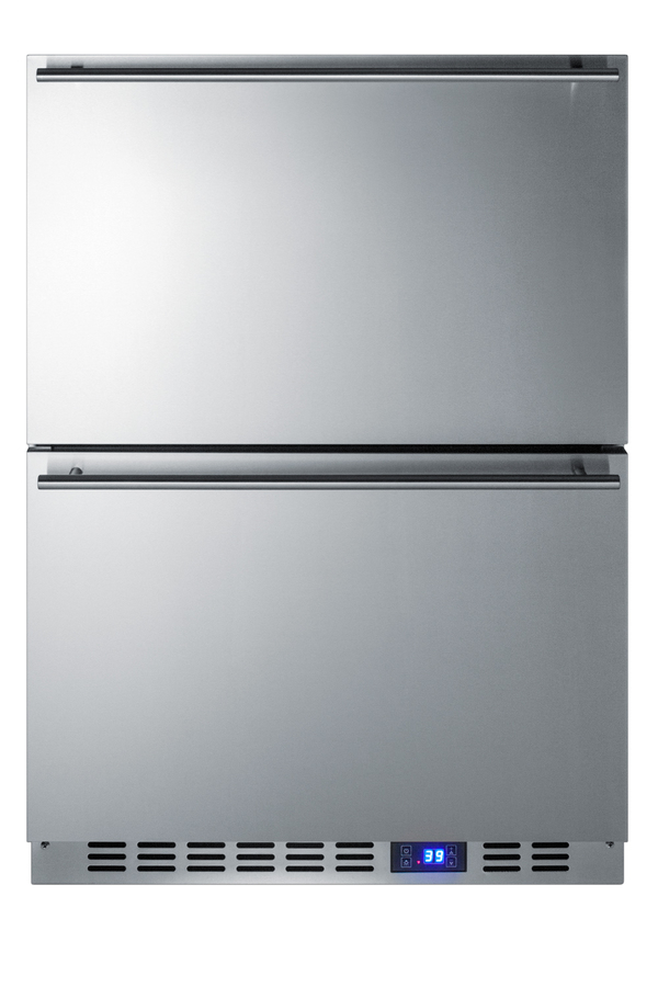 SUMMIT brings luxury and convenience under the counter with a fully featured two-drawer all-refrigerator. The FF642D is sized with an easy-fitting 24" footprint. The front-breathing system allows built-in installation, while the fully finished cabinet also enables freestanding use. Complete stainless steel construction inside and out offers long-lasting durability with professional elegance. The drawers can be customized with overlay panels to match or accent existing cabinetry design. The stainless steel kickplate and sleek handles complete the look. Frost-free operation ensures minimum user maintenance inside the 3.4 cu.ft. interior. Two adjustable dividers make it easy to separate the drawer compartments into two or four zones to easily accommodate a variety of sizes. A sliding chrome basket offers added storage convenience, while the LED lighting makes it easy to view stored contents when loading or unloading both sections. Additional features ensure the unit is running at its best. These include a high temperature alarm and open drawer alarm. The digital thermostat makes it easy to manage the interior temperature, while a temperature memory function helps to recover all settings in the event of power loss. This model also has a Sabbath Mode Setting that disables certain electrical features during periods of religious observance. The FF642D can be used in home or commercial settings. This unit is ETL-S listed to NSF-7 standards and meets UL Commercial Standard 471. For a matching frost-free all-freezer, see the SCFF532D.