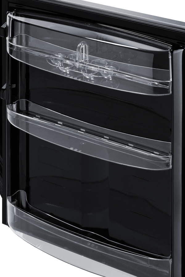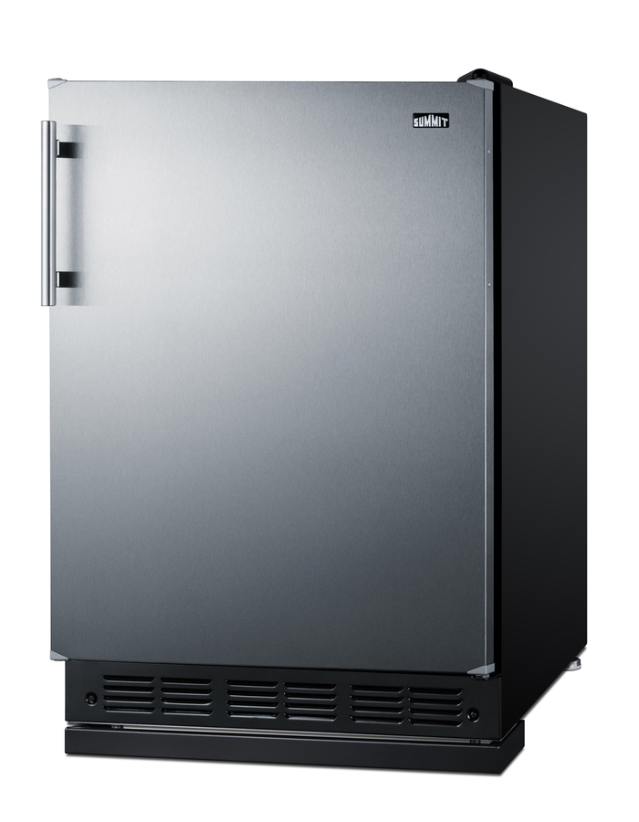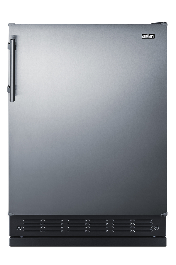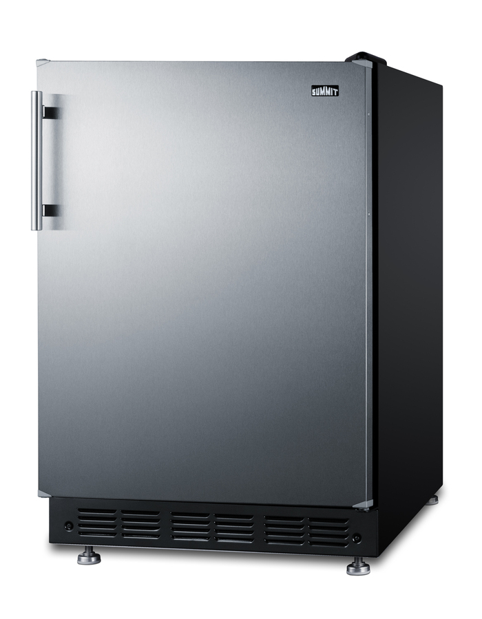 Summit's undercounter lineup of European-made refrigeration features energy efficient, counter height choices that offer the largest capacity in the industry. Sized with a 24" footprint, model FF6BK2SSRS is an ENERGY STAR certified all-refrigerator designed for recessed installation or freestanding use in residential kitchens. The user-reversible stainless steel door offers an elegant look for any kitchen, with a special coating that makes it easy to wipe off the surface for a fingerprint-resistant front. The stainless steel handle is side mounted for an easy grip and attractive look. This unit has a jet black exterior cabinet and runs quietly at less than 33 dB. Adjustable legs allow you to set the height between 33 1/2" and 34 1/2" for the perfect fit. We include a black steel leg shield for optional use if you find there is too much space between the front and floor when the unit is set at its taller height. With a full 5.8 cu.ft. interior, the FF6BK2SSRS offers a higher storage capacity than other counter height units in the market. It features a black interior liner and black trimmed adjustable glass shelves for spill-proof storage. We also include a removable scalloped steel rack ideal for holding bottles in a horizontal position. A large clear crisper makes it easy to store produce at its best and three clear door racks let you keep condiments in easy reach. A light automatically illuminates the interior when the door is open. Summit's European lineup features classic mechanical controls. The dial thermostat ensures an intuitive, trouble-free performance without any internal boards or chips. Automatic defrost reduces user maintenance and our signature cold wall design creates an efficient, reliable cooling system. The FF6BK2SSRS is UL listed for residential use. With its large capacity, professional finish, and user-friendly features, this freezerless refrigerator is a convenient option for homes, offices, schools, and other settings in need of reliable cold storage. Additional choices are available in lower ADA height, as well as with freezer compartments (model CT66BK2SSRS). Browse the full Summit catalog to discover the perfect appliance for your refrigeration needs.