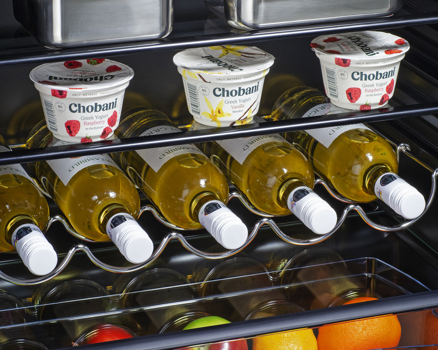 Removable scalloped steel shelf lets you keep wine and other bottles stored horizontally