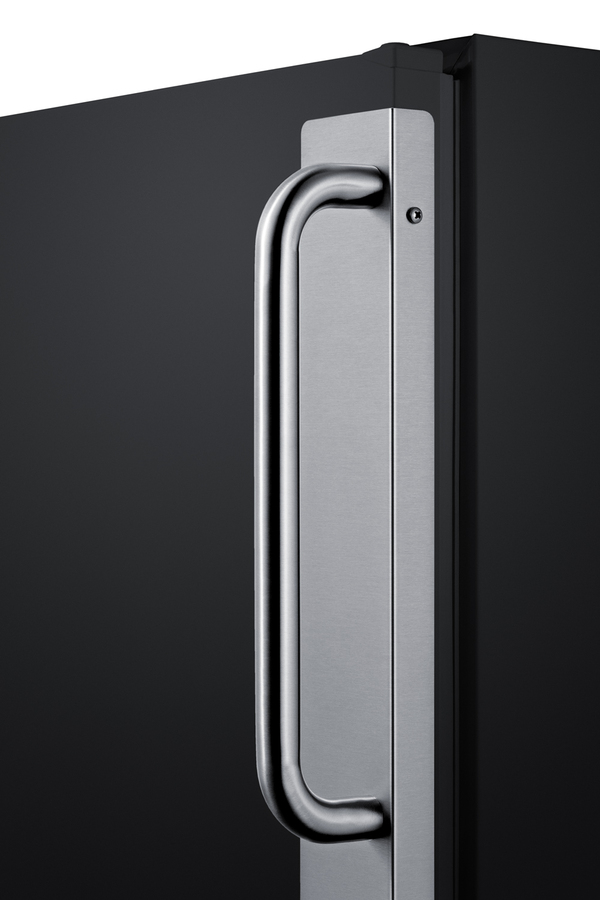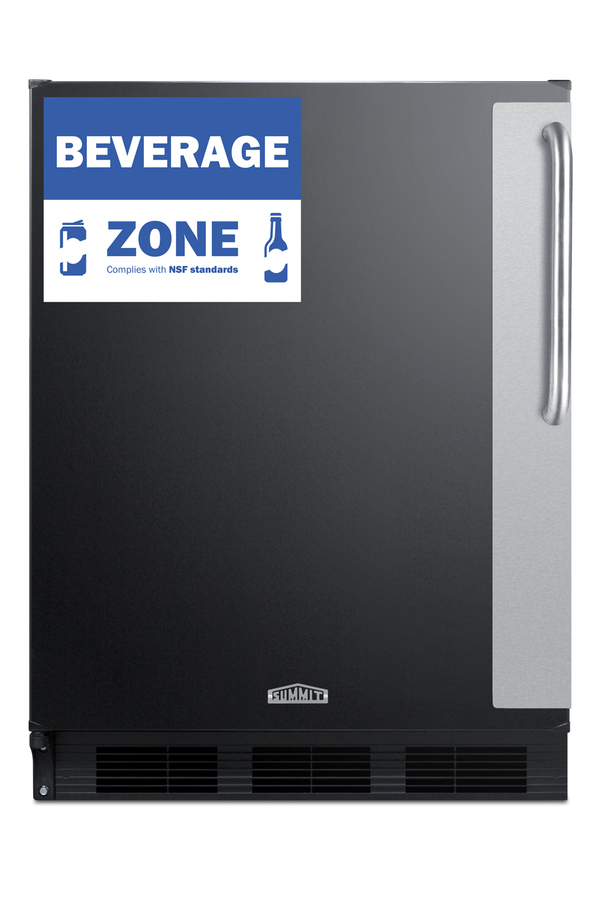Summit Commercial manufactures an extensive lineup of commercially approved European refrigeration to bring extra cold storage capability in a slim-fitting footprint. Our Beverage Zone series includes undercounter and ADA height all-refrigerators ideal for foodservice environments. Model FF6BK7BZADALHD is ETL-S listed to NSF-7 commercial standards. It comes in a jet black exterior finish with a front-mounted towel bar handle in brushed stainless steel, located at a convenient position for busy bar staff to access without reaching far down. The handle side of the door includes a factory-installed stainless steel corner guard for added protection in high traffic settings. At just under 24 inches wide and deep, this refrigerator offers a generous 5.5 cu.ft. storage capacity, larger than most units in this size class. The cabinet is sized under 32 inches (and 32 1/8 inch to the top of the hinge) in order to fit under lower ADA compliant counters. It can be used freestanding or with minimum clearance for recessed installation. NOTE: This unit comes with a left hand door swing. For the door to open from the other direction, order model FF6BK7BZADA. Made in Europe, the Beverage Zone series utilizes automatic defrost with a hidden evaporator behind the rear wall for reliable, even cooling. Adjustable glass shelves offer spill-proof storage and a removable crisper drawer allows options for holding lemons, limes, and other serving extras. The door includes two racks ideal for holding smaller bottles and cans in place. This unit has a clean white interior with an automatic light for maximum visibility, especially helpful in bars, restaurants, and settings that may be dimly lit. Additional commercial and back bar refrigeration options are available in a range of sizes and finishes, including glass door beverage centers, shallow depth storage options, and much more. Browse the full Summit product line or contact our product specialists to find the right fit for your needs.