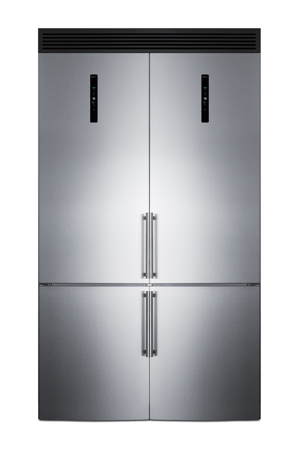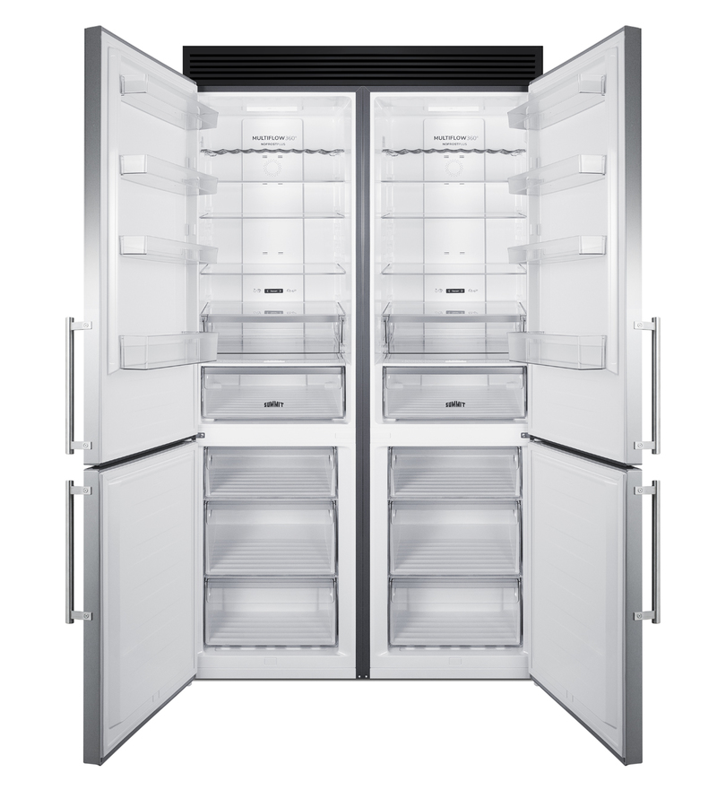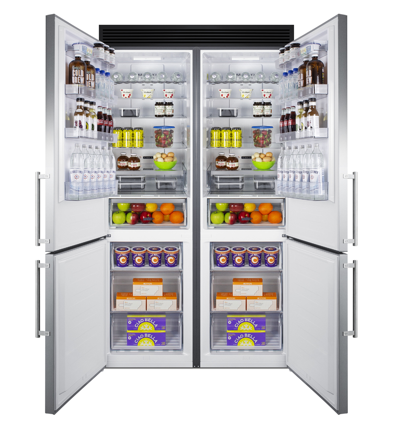 Bring European luxury to small kitchen spaces with Summit's premium counter depth bottom freezer refrigerators, available now to fill traditional 84" H x 48" W kitchen spaces. Model FFBF181ES2KIT48 combines two of our ENERGY STAR certified European bottom freezer refrigerators, both sized under 24" deep for an easy fit in shallow spaced kitchens. We ship one unit with a right hand door swing and the other with a left hand door swing, allowing you to create a French door effect for an efficient use of kitchen space. Both units feature stainless steel doors with a gentle curve and pro style handles to complete the look. We include our GRILL48B, a cosmetic top grill in black powder-coated steel to help fill standard 84" high kitchen openings. The included 6' Y-shaped NEMA 5-15P cord with a 3-prong right angle plug allows users to operate both units from one outlet without added depth. Each unit offers 11.7 cu.ft. of storage capacity to bring the overall interiors to 23.4 cu.ft. The bottom freezers include three slide-out storage drawers with clear plastic fronts, ensuring stored items are protected when the doors are open. The fresh food compartments come fully featured with adjustable glass shelves, scalloped steel bottle racks, removable door storage, large crispers, and a FreshZone deli drawer that can hold colder temperatures for meat or be converted to regular crisper conditions with an easy slide dial. Digital controls ensure easy use for both compartments, with audible temperature and open door alarms to help protect your groceries. This refrigerator is designed with AdaptTech, adaptive intelligent technology that adjusts the cooling to your habits based on the frequency of door openings. Additional features include a fast freeze setting (ideal for loading groceries) and an eco setting. SKU FFBF181ES2KIT48 ships on one pallet with the three pieces (FFBF181ES2, FFBF181ES2LHD, and GRILL48B) individually boxed.