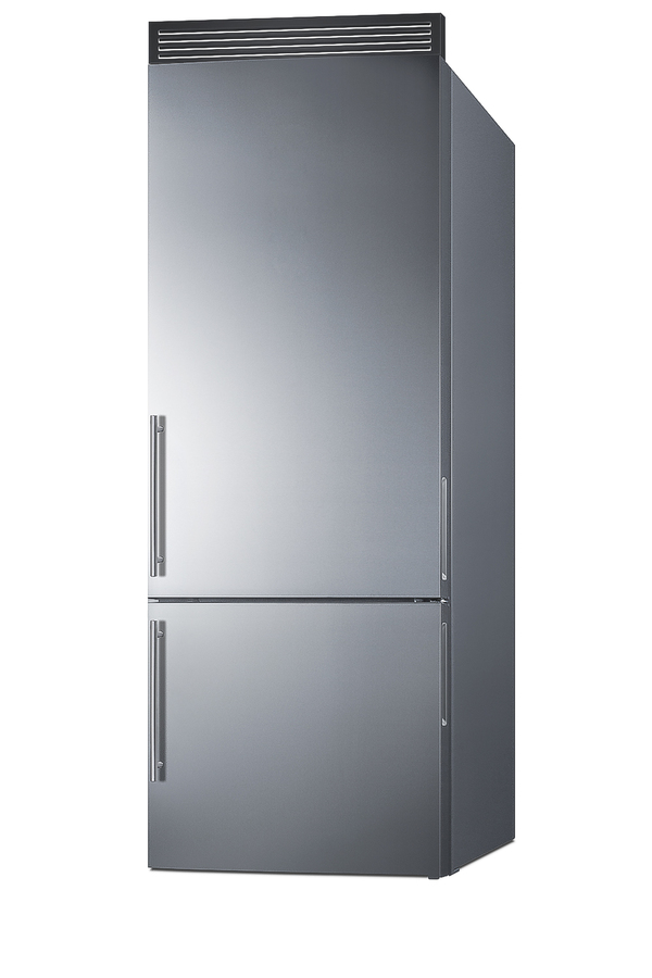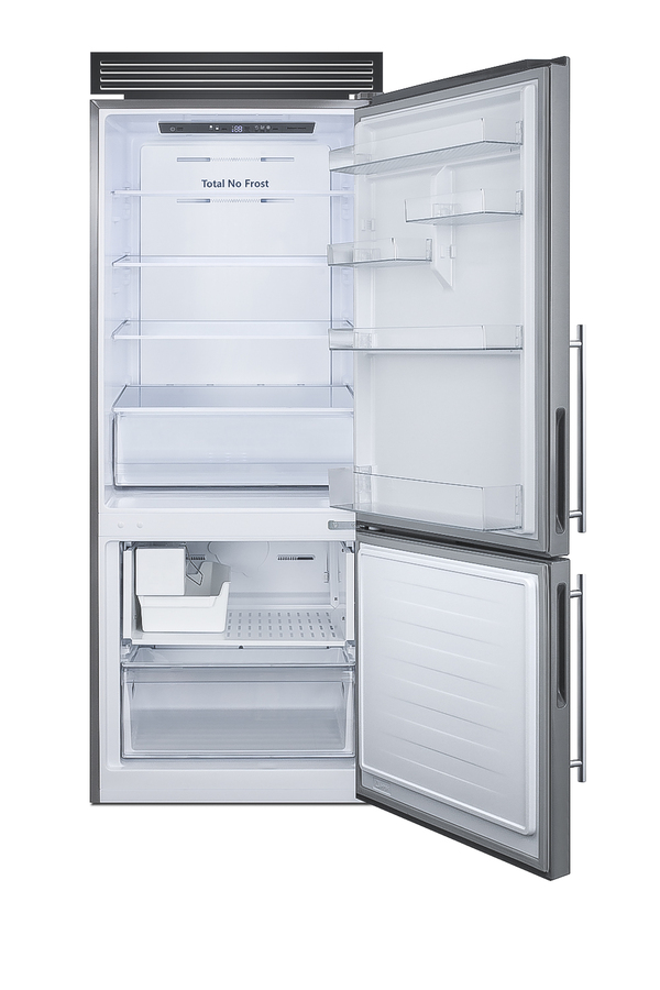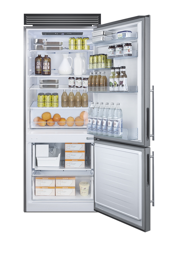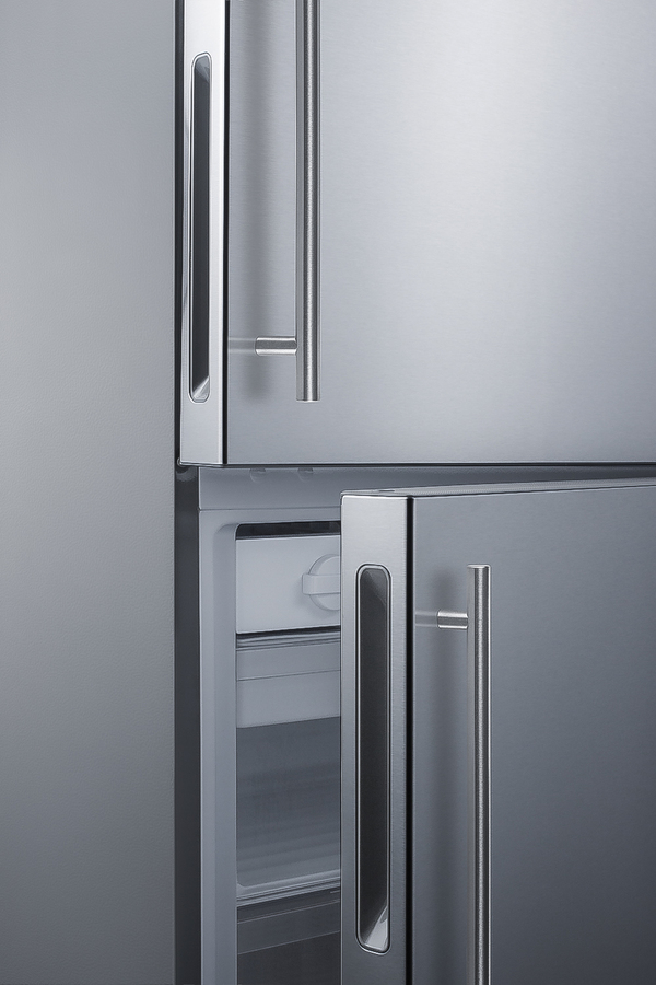 Summit's counter depth series of frost-free refrigerator-freezers provides attractive, user-friendly, and efficient solutions to bringing full storage convenience to small kitchen spaces. The FFBF279SSXIMH72 is conveniently sized at 27 5/8 inches wide and just under 27 inches deep, with a generous 14.6 cu.ft. capacity to meet a family's storage needs in minimum floor space. The stainless steel doors feature an attractive horizontal grain and stainless steel handles for a professional look. We include a decorative steel grill accessory in matte black for optional installation on top of the cabinet, allowing you to fill extra vertical space depending on your kitchen cabinetry height. This unit ships with a right hand swing (for a left hand version, see model FFBF279SSXIMH72LHD). The sealed back offers added space savings and easier cleanup. Inside, the FFBF279SSXIMH72 utilizes frost-free operation for low maintenance use. The digital controls ensure easy temperature management. It also includes a holiday setting, which allows the refrigerator to run at warmer temperatures to help save energy when not in use during vacation or other extended periods of inactivity. The refrigerator section features automatic LED lighting for an attractive, energy efficient view. Adjustable glass shelves and a full-width crisper drawer ensure easy storage. The door includes three full shelves and two adjustable half racks to best accommodate bottles and other condiments. The large freezer section features a factory-installed icemaker to keep a steady supply of crescent cubes on hand at all times. A side-out drawer in clear plastic helps to protect stored items from warmer temperature when the door is opened. A "super freeze" setting lets you run the freezer at colder temperatures, an ideal feature when loading new groceries. With its unique footprint and fully featured design, the FFBF279SSXIMH72 is a great solution for apartments and other space-challenged kitchens in need of a fully functioning refrigerator in a slim-fitting size.