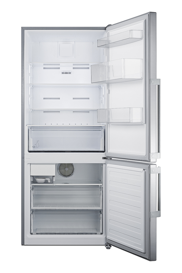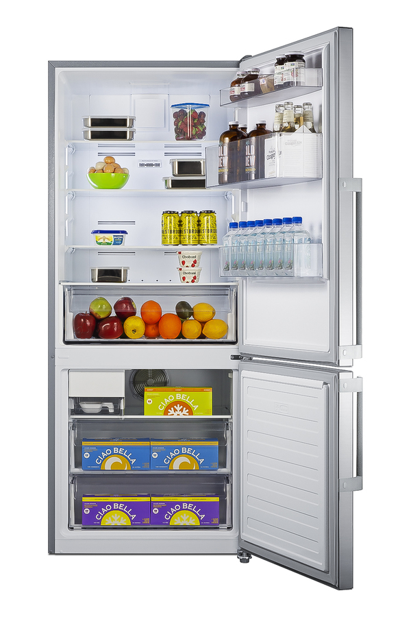 SUMMIT's thin-line series of ENERGY STAR certified counter depth bottom freezer refrigerators conserves energy and space but adds quality and function with innovative features, convenient sizes, and energy efficient operation. At just 26.25" deep and 27.63" wide, the FFBF284SSIM offers nearly 14 cu.ft. of storage capacity ideal for space-challenged kitchens with full refrigeration needs. Reversible doors allow you to adjust the door swing to best suit your space. This unit comes with a textured gray cabinet and real stainless steel doors featuring a horizontal grain and protective film that helps to keep the door clean from fingerprints and smudges. Pro style handles complete the look. Inside, the FFBF284SSIM comes fully featured for maximum storage convenience with frost-free operation ideal for minimum maintenance. The refrigerator section includes adjustable shelves made from safety glass for durability and easy cleaning. Three adjustable door racks offer additional storage options, including one deep rack that can accommodate full gallon sized containers. The large clear crisper is ideal for keeping produce fresh. An innovative touch control system lets you manage the refrigerator and freezer temperature with an intuitive digital thermostat. LED lighting in the side walls of the refrigerator offers an efficient and attractive view inside. The open door alarm alerts with an audio and visual signal when the door is left ajar for over one minute. This unit is equipped with an optional sabbath mode feature that allows you to deactivate certain electrical features for up to 76 hours. The lower freezer compartment features two slide-out drawers with plastic fronts to help protect stored items when the door is opened. A factory-installed icemaker keeps a full supply of ice on hand. With its elegant design, unique size, and full storage capacity, the FFBF284SSIM is the perfect energy efficient addition to any kitchen looking to bring true quality, modern style, and energy savings in a smaller footprint than standard household refrigerators.