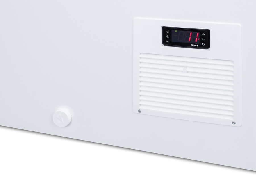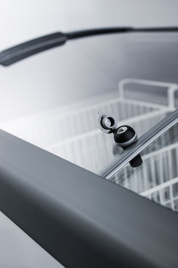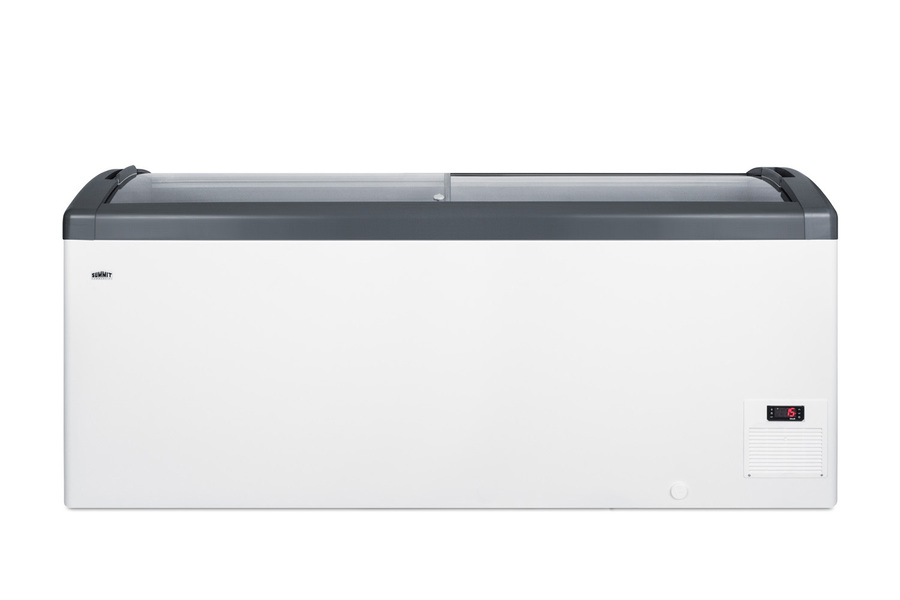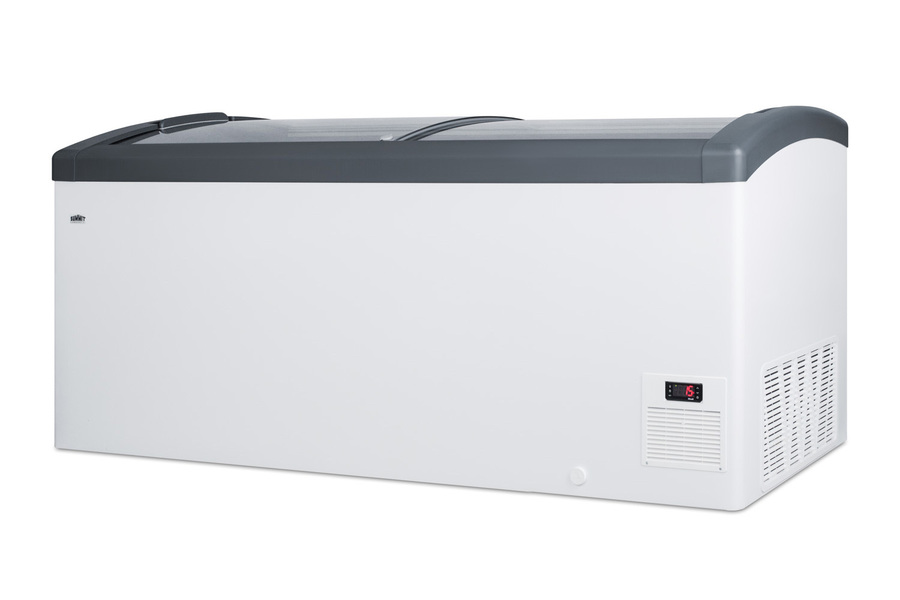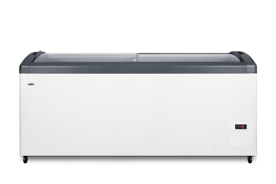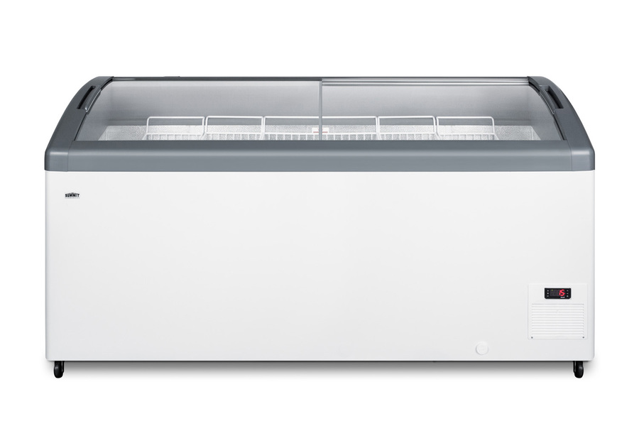 Summit Commercial's line of curved top ice cream freezers features a deluxe European design to provide quality storage and an optimum product display. Made for us by Elcold in Denmark, the FOCUS171 features two tempered glass lids on ball-bearing glides that open smoothly for added efficiency. The angled top offers increased visibility to help maximize impulse sales. This unit includes a removable keyed lock to allow users the option of securing their goods. The white cabinet suits any setting, while the gray lid trim offers an added touch of clean style. We include a set of sturdy commercial casters for users to install if they prefer the freezer more mobile. The digital thermostat is externally located for easy temperature management, with a wide range from -13 to 23ºF to accommodate a variety of desserts. We pre-set the unit to -4ºF. Inside, the FOCUS171 features hammered aluminum walls designed for lasting durability in busy commercial settings. We include six epoxy coated wire novelty baskets, ideal for storing frozen treats and designed to easily glide back and forth as needed. This unit utilizes a manual defrost cooling system with environmentally friendly R290a cooling agent and extra thick insulation to ensure added reliability. A drain is included for easy defrosting. The FOCUS171 is UL-S listed to NSF-7 commercial standards. Additional sizes are available.