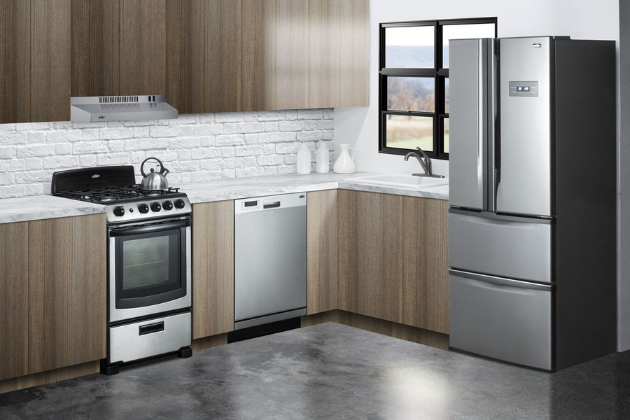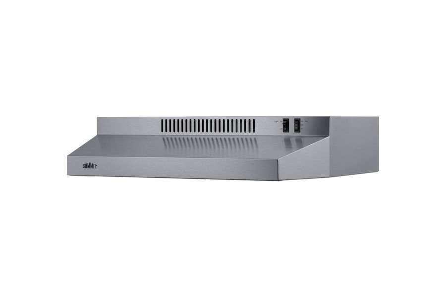 Summit's under cabinet convertible range hoods offer versatile ventilation solutions for every kitchen space. Model H24RSS is a 24" wide range hood ideal for apartments and other smaller kitchens. It features an attractive stainless steel finish with a horizontal grain. We include a pre-installed light bulb to illuminate your cooking surface. The 2-speed fan is easily managed by a rocker switch with a high and low ventilation setting. This hood is convertible for horizontal or vertical ducted ventilation or ductless/recirculating ventilation where no exhaust connection to the outside is available. It ships ready for standard 3 1/4" x 10" rectangular ducting, but it can be used with a round 6" or 7" duct with the addition of a transition (not included). We include a metal mesh filter to catch grease and a charcoal filter to absorb smoke and odors when using in recirculating applications. This unit does not include a power cord and is designed to be hard-wired by a licensed professional. Additional convertible range hoods are available in 18", 20", 30", and 36" sizes, with more styles and choices coming soon. We also manufacture an extensive selection of 24" wide ranges and cooktops, providing complete kitchen solutions at incredible value. Browse the full Summit product line to explore your options.