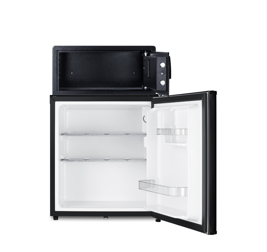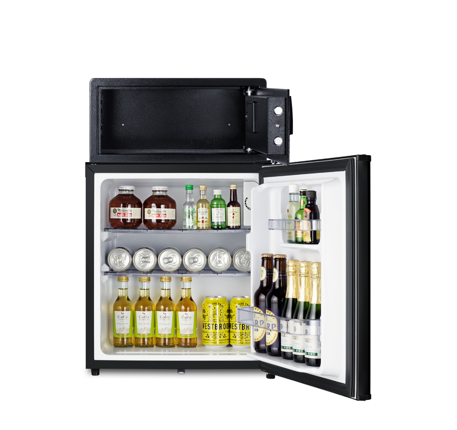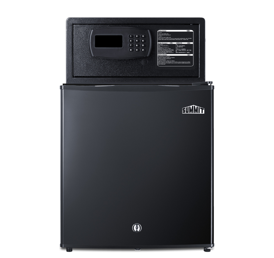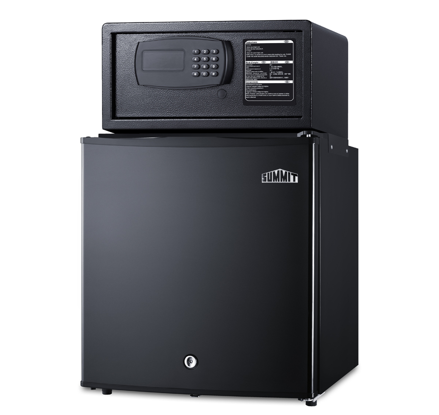 Summit manufactures a wide selection of appliances to maximize the hospitality experience for hotel guests. The MBSAFEB combines our 18" wide compact in-room minibar (MB41B) with our battery-powered in-room safe (HSF10B). The MB41B offers a generous 1.6 cu.ft. capacity with a clean white interior for full visibility of contents. A compressor-based cooling system provides proper refrigeration conditions to keep stored items cold, while the laboratory-tested operation ensures quiet operation at under 33 decibels. Inside, you will find two removable plastic shelves for versatile storage, with flat bottoms to help keep bottles standing and perforation to ensure more efficient cooling. The HSF10B features an intuitive digital keypad with clear instructions for programming the 4-digit guest code printed on the door in four languages. A 6-digit master override code is also provided for management, in case of emergencies. Each safe ships with one master key as a backup for lost codes or battery outages. To help prevent unauthorized access, the safe will automatically lock down for 15 minutes if the wrong code is entered three times. HSF10B runs on four AA batteries (included). Note: This unit ships in three boxes and will require some installation. With its ease of use and streamlined security, the MBSAFEB offers unmatched convenience, protection, and much-needed peace of mind to elevate your guests' experience. For this combo unit in glass see model MBSAFEG. For this combo unit in stainless steel see model MBSAFESS. We also offer in-room drawer refrigeration, beverage coolers, and many other innovative solutions. Visit summitappliance.com to explore our complete hospitality line and find the perfect solution for your guests.