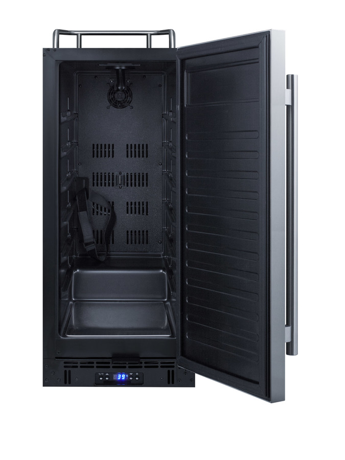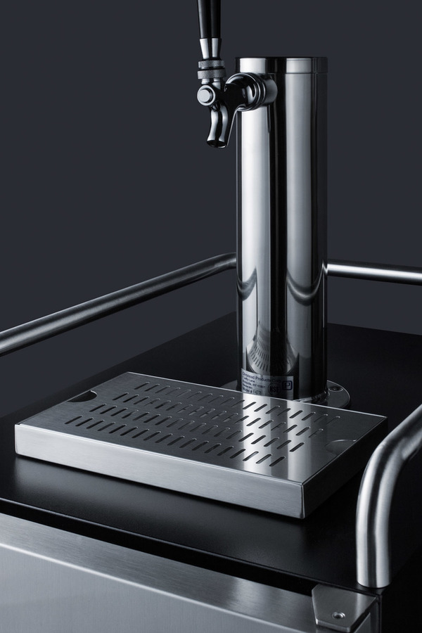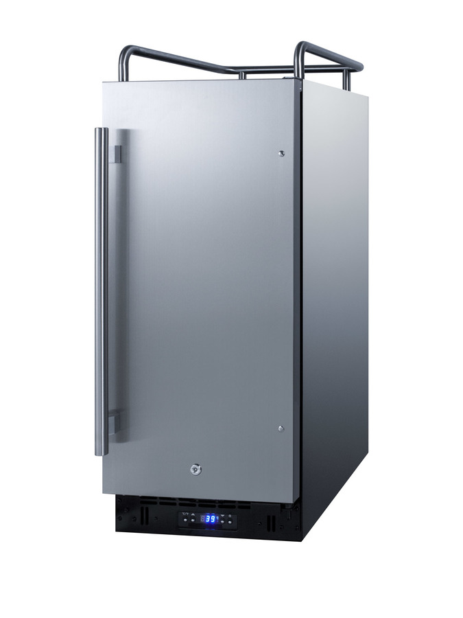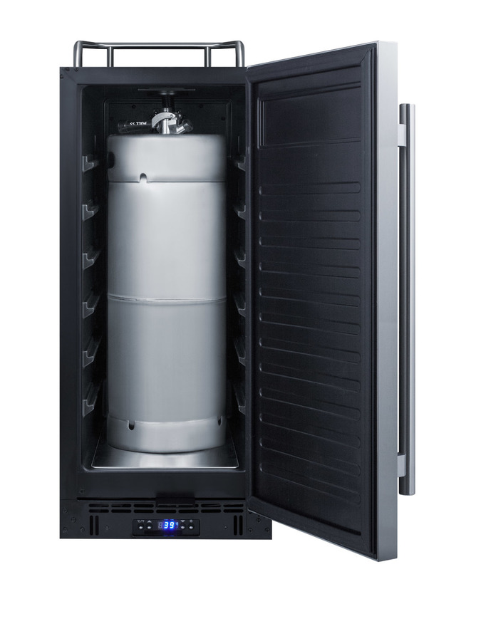 Summit offers a complete line of built-in kegerators/beer dispensers designed for use in commercial establishments. The SBC15NKCSS features a versatile design that meets NSF-7 and UL-471 commercial standards but is also approved for residential applications. Sized at 15" wide, it features a front-breathing design for built-in installation under counters and a fully finished cabinet for freestanding use. A stainless steel door and cabinet afford added elegance to any setting, while the stainless steel handle completes the look. The sealed back allows for easy cleaning of the unit. Features include a removable two-piece stainless steel drip tray to collect spills and a chrome guard rail to help keep glasses and mugs in place. The user-reversible door swing makes it easy to accommodate any location’s setup and four included casters (two are locking) make movement of the unit easy. A factory-installed lock provides added security. Inside, the 2.9 cu. ft. interior can hold a 1/6 (sixtel) or mini keg. Two chrome shelves, with six placement options, allow the kegerator to also function as a beverage refrigerator. A digital thermostat makes it easy to manage the temperature, while the external digital display has a readout in Celsius or Fahrenheit. Automatic defrost operation ensures minimal user maintenance. A tap cool system keeps your beer cold as it goes through your tower, and a Velcro strap holds the Co2 tank in place. A stainless steel floor plate provides added protection when placing and removing kegs. This unit can accommodate a tap kit, purchased by the user or through Summit, for dispensing beer, wine, coffee, nitro coffee, or kombucha. Browse Summit's tap kit options at www.summitappliance.com. Note: Due to its door design, the SBC15NKCSS requires an additional 1/4" of width for the door to open to a full 90º. If placing this unit against a right angle wall, be sure to accommodate this extra space.