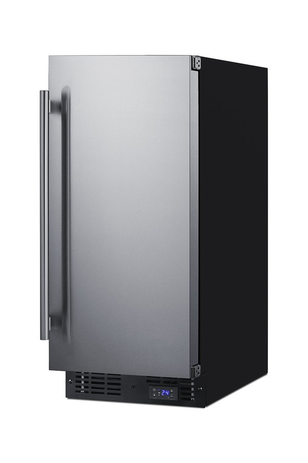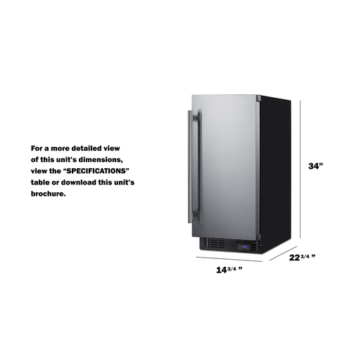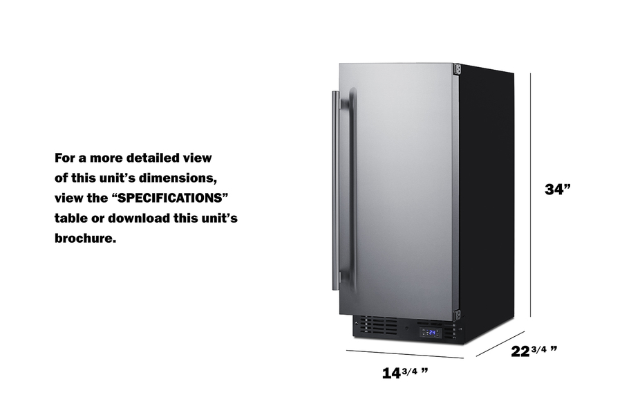 Summit brings true convenience to small kitchen spaces with the SCFF1533BSS, a 15" wide fully frost-free all-freezer. The SCFF1533BSS is front-breathing for built-in use under counters, but also features a fully finished black cabinet to allow freestanding use. The user reversible door is fully wrapped in stainless steel and a factory installed lock offers keyed security. This unit includes our fully articulating European style hinge design. Inside, the SCFF1533BSS is fully frost-free to minimize user maintenance, with slide-out chrome shelves that can be adjusted to accommodate a variety of items. Recessed LED lighting provides an elegant and efficient display inside the 2.4 cu.ft. interior. This unit includes a digital thermostat in the kickplate for easy and intuitive temperature control. With a uniquely slim size and user-friendly features, the SCFF1533BSS is the ideal freezer for space-challenged homes. This unit can be paired with the matching FF1532BSS all-refrigerator as a side-by-side set or combined with our Stack15.