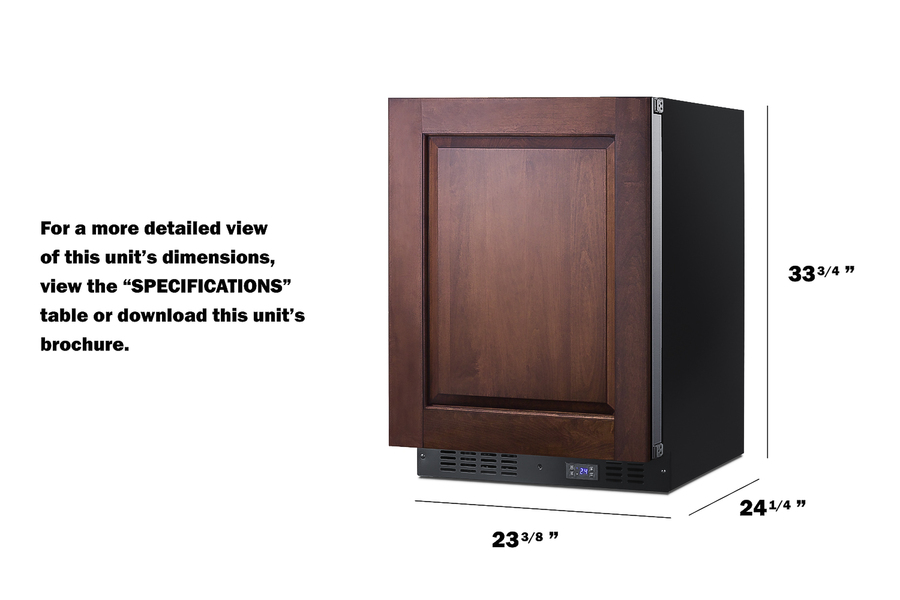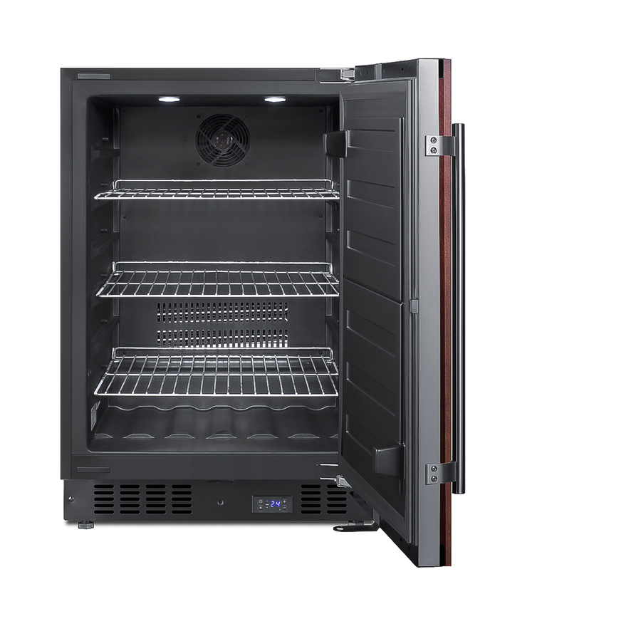 Summit's SCFF53B Series brings quality and convenience under the counter with a fully featured lineup of built-in frost-free all-freezers. Sized with a convenient 24" footprint, the SCFF53BIF freezer can be used built-in or freestanding. It has a black cabinet with a sealed back for easy cleaning. The door comes with a European style fully articulating hinge, making it easy to install an overlay panel to create a custom look that blends into your cabinetry. Inside, the SCFF53BIF utilizes frost-free operation with fan-forced cooling to ensure low maintenance and even temperature distribution. Recessed LED lighting offers an attractive yet efficient look. The digital thermostat makes it easy to manage the interior temperature. This unit includes adjustable chrome shelves for flexible storage. Additional features include an open door alarm, high temperature alarm, and Sabbath mode setting that lets you disable some of the electrical elements during periods of observance. With its deluxe style and user-friendly features, this unit is the perfect choice for home kitchens. For a matching frost-free all-refrigerator, see the FF64BIF.