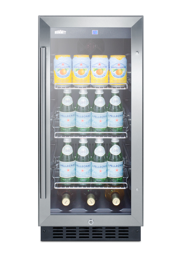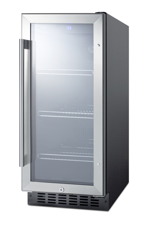 SUMMIT offers a complete line of 15" wide appliances for built-in installation under residential or commercial counters. The SCR1536BG is a slim-fitting 14 3/4 inch wide beverage refrigerator that meets UL-471 standards and is ETL-S listed to NSF-7 for use in commercial settings but is also approved for residential applications. The front-breathing design allows built-in installation under counters, while the fully finished black cabinet also makes it possible to use freestanding. This unit features a user-reversible double pante tempered glass with door with stainless steel trim. A factory-installed lock offers convenient security as needed. Inside, the SCR1536BG includes three adjustable chrome shelves for flexible storage. LED lighting offers an attractive and efficient view inside the black interior. The interior control panel includes a digital thermostat for easy temperature control, with an external readout in Celsius or Fahrenheit. This unit utilizes automatic defrost for easy maintenance. Additional features include audible warning alarms for high temperature and open door alerts, Sabbath mode, and a temperature memory function that restores your settings in the event of power loss. With its perfect size and user-friendly features, the SCR1536BG brings true convenience under the counter. To create a complete bar set, pair this model with our matching SWC1535B wine cellar, along with our extended lineup of 15" wide refrigerators, freezers, and icemakers.