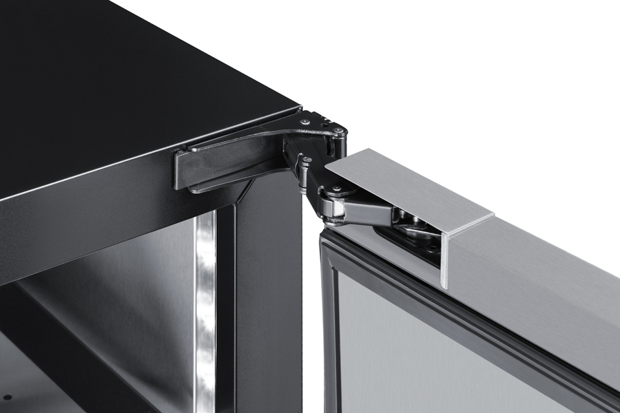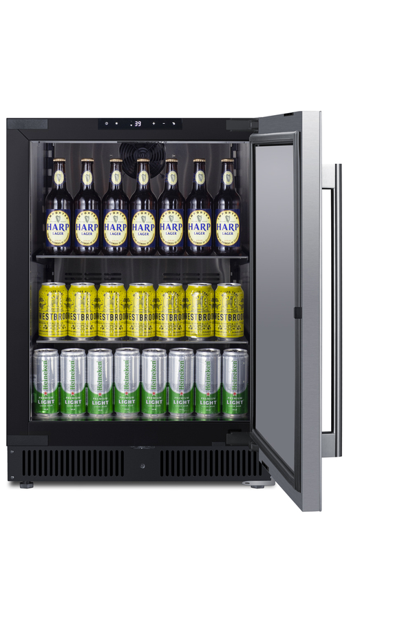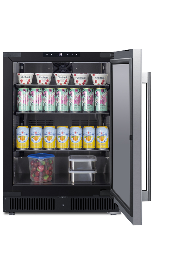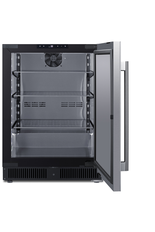 Summit manufactures a wide selection of premium refrigeration designed to bring style and function under the counter. The SCR610BLSD comes in an easy-fitting 24" footprint, with a front-breathing design that can be built-in under counters or used freestanding. The reversible door includes a professional handle, fully articulating European style hinge, and factory installed lock. A digital thermostat ensures precise temperature management. Inside, the SCR610BLSD utilizes low maintenance automatic defrost operation with an internal fan to ensure even temperature distribution. Recessed LED lighting offers the perfect display conditions inside the durable and easy-to-clean stainless steel interior. This unit includes three cantilevered chrome shelves to ensure flexible storage that accommodates any item size. The interior is taller than many refrigerators in its class, allowing the unit to easily store two rows of 12" high bottles. High temperature and open door alarms offer added protection for stored items. Variations of this model are available with glass or panel-ready doors, as well as choices in slimmer widths and ADA compliant height. Browse the complete selection to discover the perfect refrigeration choice for your space.