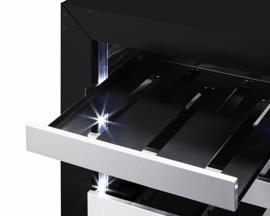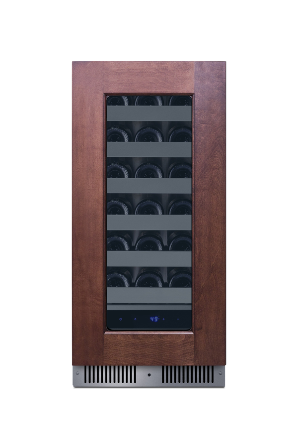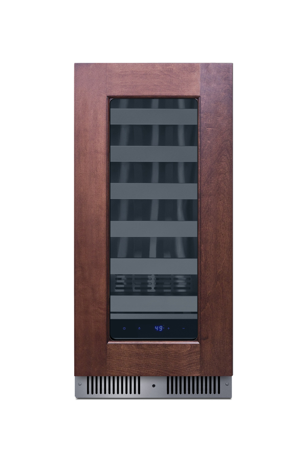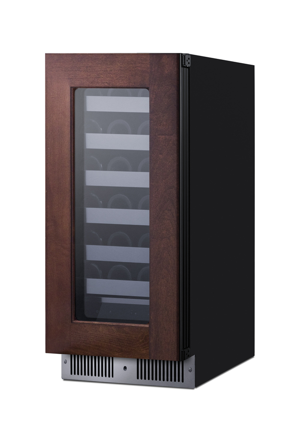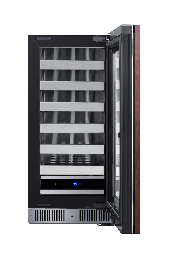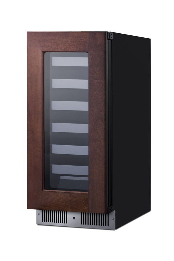 Summit's shallow-depth series of built-in undercounter refrigeration brings full functionality to kitchen islands, wet bars, and other settings with space limitations. The SDHW1532PNR is a 15" wide single-zone wine cellar sized at 18" deep. It comes in a 34" height to fit standard undercounter spaces. The front-breathing system allows built-in installation, while the fully finished black cabinet also allows freestanding use. This unit has a sealed rear and right angle cord for a better fit. A lock is located in the kickplate for added security. The panel-ready SDHW1532PNR features our fully articulating European hinge, with a 2-piece bracket kit included to allow easy installation of your own custom door trim. The user-reversible door swing allows easy adjustment as needed. The inside features stainless steel construction for improved durability and sanitation. White LED lighting in the side walls provides elegant display conditions, with dimmable levels that let you create the perfect presentation. The angled digital control panel enables you to adjust the temperature between 41º and 68ºF to accommodate red, white, or sparkling wine bottles. Our uniquely designed steel shelves in a jet black finish slide out smoothly, with stainless steel front trim to complete the classic look. Fan-forced cooling ensures even temperature distribution and fast temperature recovery. Additional features include an open-door alarm, a high-temperature alarm, and a Sabbath mode setting that turns off some electrical elements for up to 96 hours during observances. With its deluxe style, user-friendly features, and uniquely shallow depth, this unit offers premium value for a variety of settings. Create a matching set by pairing this with our SDHG1533PNR beverage center. Alternative 18" deep choices are available in 15", 19", and 24" widths, including outdoor refrigerators, refrigerator drawers, and more. NOTE: The interior can store up to 18 Bordeaux-style bottles. Due to the shallow depth of this unit, we recommend loading the bottles with the cork facing the rear for a better fit. Wider Burgundy bottles will fit on most shelves, but as these may vary more in size, loading capacity will ultimately depend on your specific bottle. You may also remove shelves to accommodate thicker bottles, such as champagne and sparkling wine.