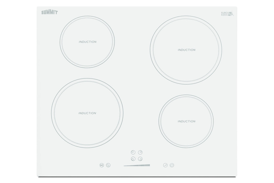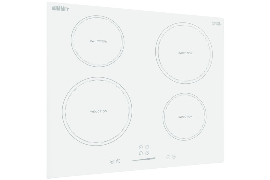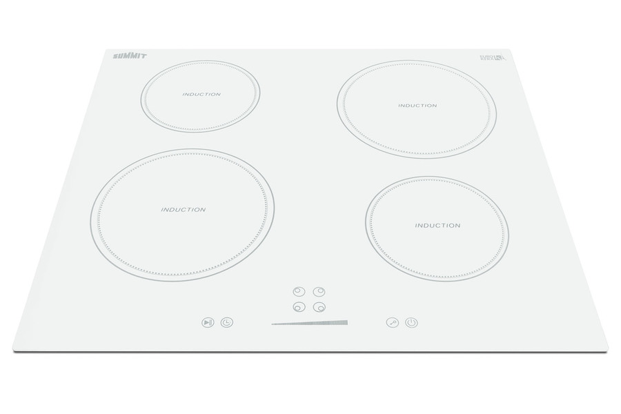 Enjoy the ease, speed, and safety of induction cooking with Summit's selection of energy efficient induction cooktops. The SINC4B242W is a 4-zone induction cooktop designed for use with 208-240V power sources. It comes in a popular size ideal for smaller kitchen spaces, including hotel suites and studio apartments. It is designed for installation in common cutouts sized at 21 7/8" W x 19 5/8" D. This unit requires professional installation (cord not included). Smooth white glass made by EuroKera creates an attractive, easy-to-clean surface. The front left and rear right elements are sized at 8 1/4" and operate at 2000W, ideal for boiling large pots of water or cooking with woks and other large cookware. The rear left and front right 1500W elements are sized at 6 1/4". The smart burner layout helps provide plenty of room so that larger cooking vessels are spaced apart, making it easier to use all four elements without cookware colliding. Centered upfront for convenient use, the touch controls allow intuitive operation, with a slider control panel that makes it easy to adjust your heat. The digital display shows which elements are in use and their power setting. Audible beeps sound when the touch controls are activated. This cooktop is equipped with a child lock that allows you to disable the controls to prevent unintended heating. A "stop & go" function allows you to immediately turn both zones off if needed, with the last settings resuming when reactivated. This unit also includes a timer function that lets you program a power level and cook time (up to 99 minutes) that can either turn the unit off when complete, or serve as a visual countdown with an audible alert when the set time has been reached. Safety features include automatic shutdown, overheat protection, and overflow protection, which will temporarily disable the power if boiling liquid touches the control panel. With its ideal size and advanced safety features, the SINC4B242W is the perfect cooktop to ensure intuitive, safe cooking in a variety of small kitchen settings. For this unit in a black finish, see the SINC4B241B. Additional choices are available in smaller and larger sizes, as well as radiant and coil styles. Browse the full Summit line for more options. NOTE: Induction cooling utilizes magnetized energy that starts inside the cookware, meaning the temperature of the actual cooktop surface does not get nearly as hot as traditional gas or electric elements. Most of the heat is retained inside your cookware, making induction technology the most efficient heating method for your kitchen. Because induction cooking requires magnetic energy, your cookware must be made of cast iron, steel, or magnetic stainless steel. Materials that will not work include aluminum, copper, and non-magnetic stainless steel. Many of your current pots and pans may already be induction-friendly. In order to determine if your cookware will work on an induction surface, simply place a magnet (such as one hanging on your refrigerator) on the bottom of the pan. If the magnet sticks, the pan will cook. Summit also offers an induction cookware set for purchase.
