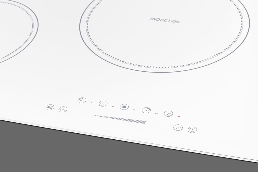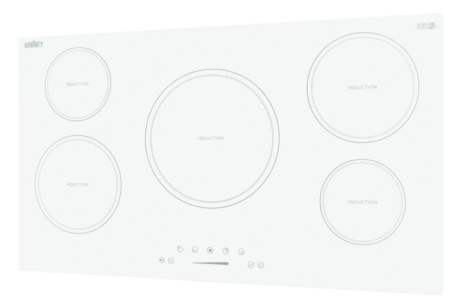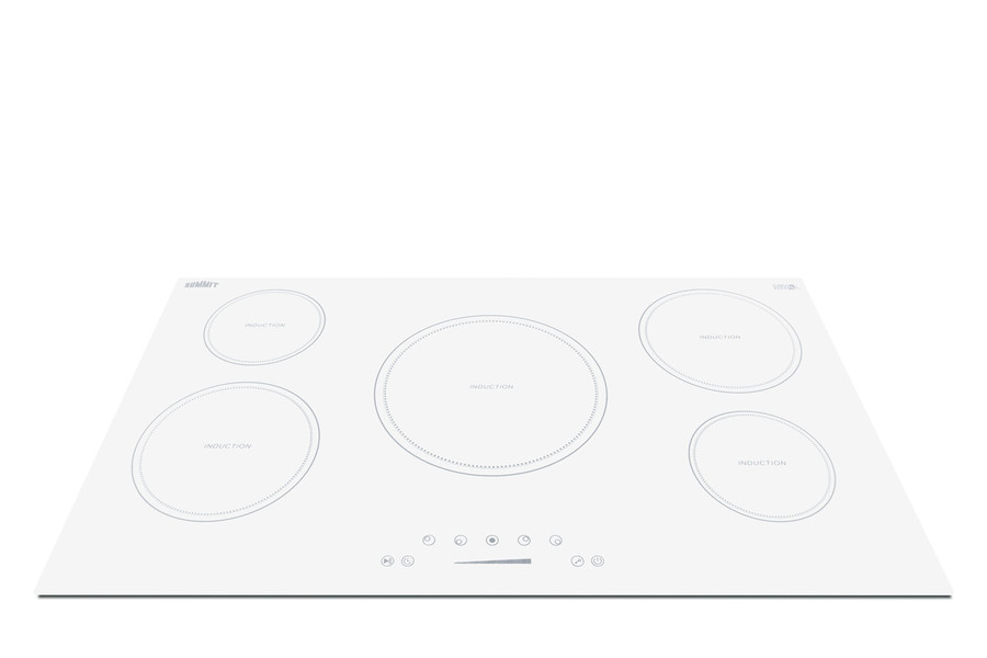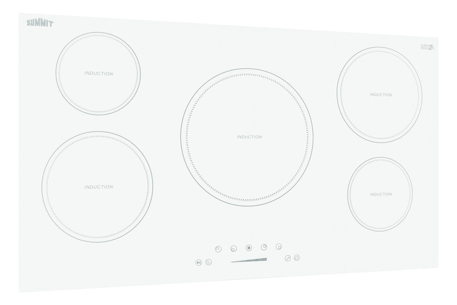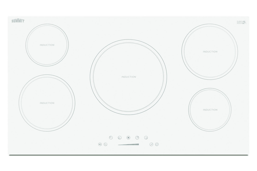 Enjoy the ease, speed, and safety of induction cooking with Summit's selection of energy efficient induction cooktops. The SINC5B36W is a 5-zone induction cooktop designed for use with 208-240V power sources. It comes in a popular 36" width that fits commonly sized 34 5/8" W x 19 5/8" D cutouts. This unit requires professional installation (cord not included). Smooth white glass made by EuroKera creates an attractive, easy-to-clean surface. The center 2300W zone features an extra large 11" radius, perfect for woks and other oversized cookware. The 2000W front left and rear right elements are sized at 8 1/4", ideal for boiling large pots of water or cooking with woks and other large cookware. The 6 1/4" rear left and front right elements reach 1500W to accommodate more general heating needs. The smart burner layout helps provide plenty of room so that larger cooking vessels are spaced apart, making it easier to use all four elements without cookware colliding. Centered upfront for convenient use, the touch controls allow intuitive operation, with a slider control panel that makes it easy to adjust your heat. The digital display shows which elements are in use and their power setting. Audible beeps sound when the touch controls are activated. This cooktop is equipped with a child lock that allows you to disable the controls to prevent unintended heating. A "stop & go" function allows you to immediately turn both zones off if needed, with the last settings resuming when reactivated. This unit also includes a timer function that lets you program a power level and cook time (up to 99 minutes) that can either turn the unit off when complete, or serve as a visual countdown with an audible alert when the set time has been reached. Safety features include automatic shutdown, overheat protection, and overflow protection, which will temporarily disable the power if boiling liquid touches the control panel. With its ideal size and advanced safety features, the SINC5B36W is the perfect cooktop to ensure intuitive, safe cooking in a variety of small kitchen settings. For this unit in a black finish, see the SINC5B36B. Additional choices are available in smaller and larger sizes, as well as radiant and coil styles. Browse the full Summit line for more options. NOTE: Induction cooling utilizes magnetized energy that starts inside the cookware, meaning the temperature of the actual cooktop surface does not get nearly as hot as traditional gas or electric elements. Most of the heat is retained inside your cookware, making induction technology the most efficient heating method for your kitchen. Because induction cooking requires magnetic energy, your cookware must be made of cast iron, steel, or magnetic stainless steel. Materials that will not work include aluminum, copper, and non-magnetic stainless steel. Many of your current pots and pans may already be induction-friendly. In order to determine if your cookware will work on an induction surface, simply place a magnet (such as one hanging on your refrigerator) on the bottom of the pan. If the magnet sticks, the pan will cook. Summit also offers an induction cookware set for purchase.