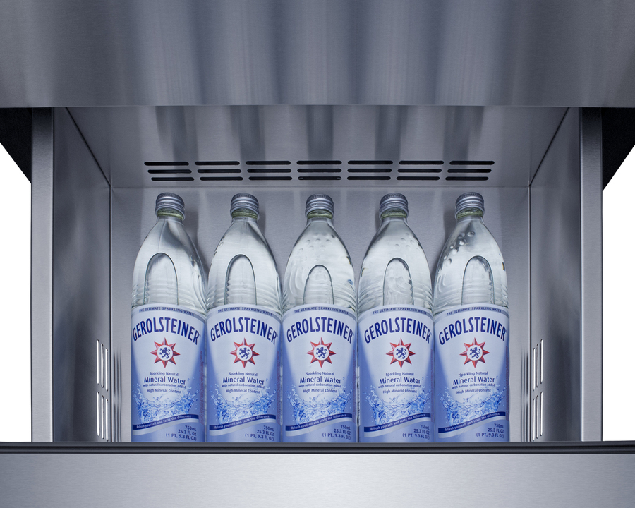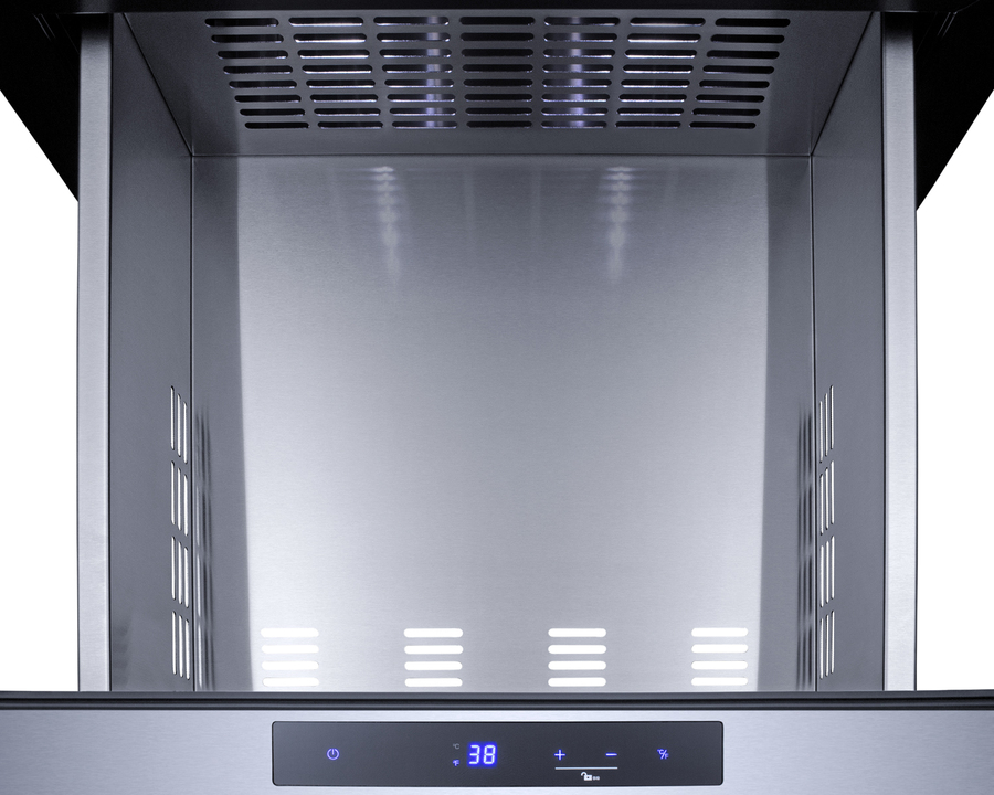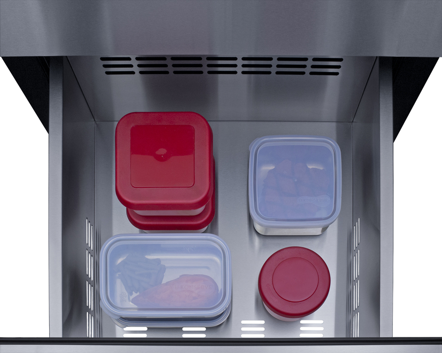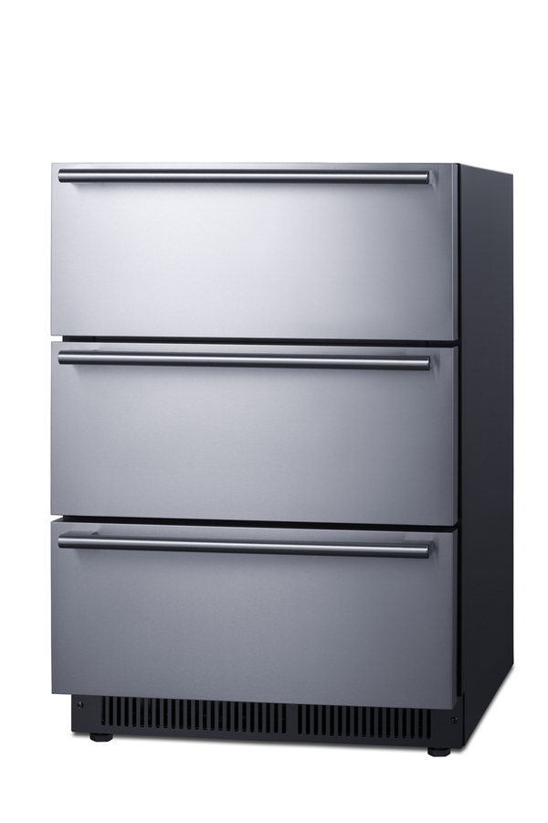 Summit brings luxury and convenience under the counter with a fully featured 3-drawer all-refrigerator. Model SP6DS3D is sized with an easy-fitting 24" footprint. The front-breathing system allows built-in installation, while the fully finished cabinet enables freestanding use. The three drawers are constructed from stainless steel inside and out for lasting durability and easy-to-clean convenience. Professional handles complete the look. This unit has a sealed back and right angle plug for added space savings. Inside, the SP6DS3D utilizes frost-free cooling for minimum user maintenance. With three separate drawers, this refrigerator allows you to better organize your items. Keep meat separate from dairy, or animal products separate from plant-based. The durable steel interiors are perfect for holding cans or horizontally placed bottles as well. LED lighting in the top drawer offers an efficient and attractive view. The intuitive digital control panel is easy to read and even easier to use, featuring an indicator light to announce which function is activated with an external readout in Celsius or Fahrenheit. It is externally located on the top drawer for easy access. Additional features ensure the unit is running at its best. These include a high temperature alarm and an open drawer alarm. A temperature memory function helps to recover all settings in the event of power loss. This model also includes a Sabbath Mode Setting that disables certain electrical features for up to 96 hours during periods of religious observance. The SP6DS3D can be used in home or commercial settings. This unit is ETL-S listed to NSF-7 standards and meets UL Commercial Standard 471. For an outdoor version, see model SP6DS3DOS. Additional 2-drawer refrigerators are available in 15", 18", 24", 27", 30", and 36" widths. Browse the full Summit lineup to explore the industry's most extensive collection of built-in drawer refrigeration.