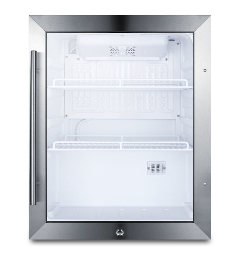 Summit Commercial's line of weatherproof appliances offers compact solutions for beverage storage in a variety of outdoor foodservice settings. The SPR314LOSCSS is a compact beverage merchandiser conveniently sized for freestanding use on top of counters. It is ETL-S listed to NSF-7 standards and meets UL-471, with a weatherproof design to ensure safe use in outdoor spaces. The stainless steel trimmed double pane tempered glass door includes a pro style handle and front lock for added security. The door is user-reversible to accommodate any setup. This unit comes in a stainless steel wrapped cabinet and sealed back for added protection from the elements. Inside, the SPR314LOSCSS features LED lighting to provide an attractive display when the door is opened. Two adjustable wire shelves offer plenty of storage options, and the white interior finish helps to ensure better visibility for stored products. This unit utilizes automatic defrost to reduce user maintenance. The dial thermostat is located inside to prevent unsupervised temperature changes. With its compact size and weatherproof construction, the SPR314LOSCSS is an ideal choice for restaurants with outdoor seating, bar counters, hydration stations, and other areas in need of reliable refrigeration in an easy fit.