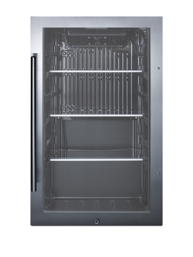 Summit's line of outdoor appliances includes slim-fitting display beverage centers designed for optimum storage and product presentation. The SPR488BOS features a versatile design that meets NSF-7 and UL-471 commercial standards, but is also approved for residential use. Sized at just 19 inches wide and 17 inches deep, it features a jet black cabinet with a sealed back for safe installation in the outdoors. The user-reversible double pane tempered glass door includes a seamless stainless steel trim and a pro style handle. A factory installed lock offers added security, while the space-saving right angle plug and integrated hinge provide added flexibility in unit placement. Two leveling legs keep the unit level on uneven surfaces. Inside, the SPR488BOS utilizes an internal fan to ensure the interior is evenly cooled from top to bottom, while the automatic defrost system allows for minimal user maintenance. LED lighting allows full visibility of stored items in the jet black interior. Three adjustable glass shelves with six positions provide optimal storage capacity inside the 3.1 cu. ft. interior. The dial thermostat, with seven temperature settings, is located in the upper-right corner for easy temperature management. The SPR488BOS can be installed indoors or outdoors and is designed for built-in or freestanding use. For this unit in a lower ADA compliant height, see the SPR488BOSADA.