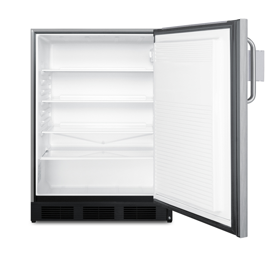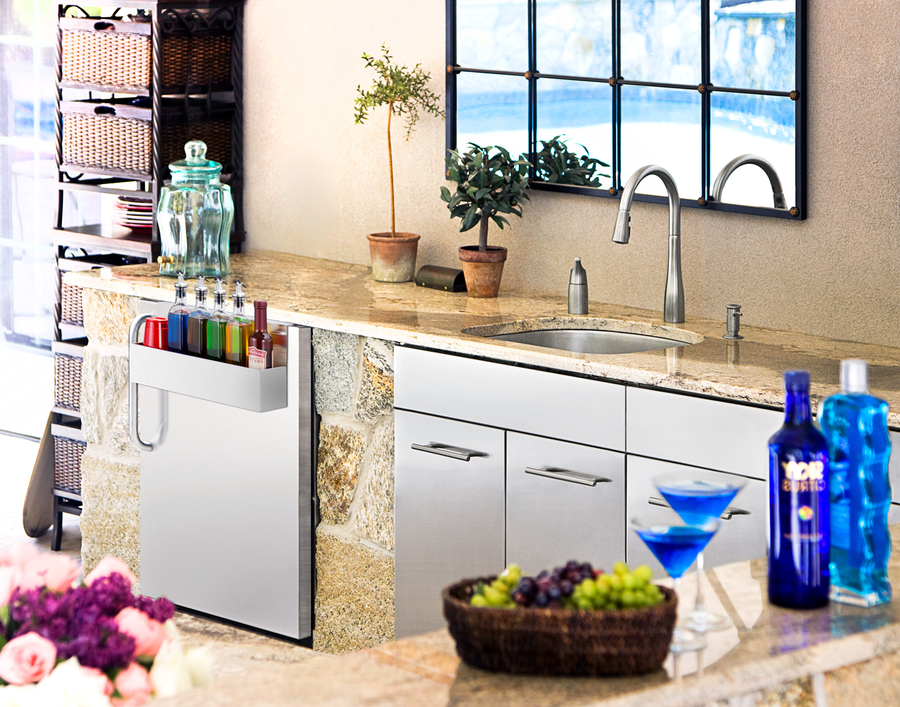 Summit offers a wide range of outdoor approved all-refrigerators for commercial use, with weatherproof designs and fully featured interiors for user convenience. The SPR7BOSSTSR has a front-breathing design for built-in installation, while the 304 grade stainless steel cabinet affords freestanding use in a durable, weatherproof design that protects from the elements. The door includes a curved towel bar handle for added style. An integrated Ground Fault Circuit Interrupter (GFCI) meets and exceeds U.L. safety requirements to protect the unit from electric shock and a sealed back keeps all components safe from the elements. For added commercial convenience, we include our 18" wide single-tier Speed Rail for easy storage and display of your bar favorites, such as mixers and liquors. Complete 304 grade stainless steel construction ensures long-lasting durability in an easy-cleaning design. The hook-style back allows for quick installation, while allowing users to remove and reposition it to best meet their needs. Two velcro strips affixed to the back assure a tight, secure fit for added safety. Inside, the SPR7BOSSTSR offers 5.5 cu.ft. of storage space in the automatic defrost interior. Our "hidden" evaporator maximizes interior space and a one-piece seamless liner makes it easy to clean. Adjustable glass shelves offer flexible storage. This unit has a dial thermostat for simple and intuitive temperature management and an interior light with an on/off rocker switch. The SPR7BOSSTSR is ETL-S listed to NSF-7 standards for use in commercial establishments such as outdoor bars, restaurants, and similar outdoor environments seeking dependable refrigeration in a stylish design. Models designed for indoor use with an included Speed Rail are available, including a freestanding model (FF7BKSSTBSR) and a built-in, ADA model (see the FF7BKBISSTBADASR).