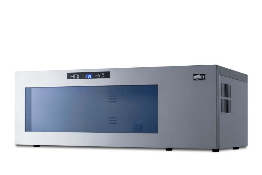 Summit Commercial brings unique solutions to wine storage with the STC series of open bottle wine coolers. The STC12 is a countertop wine chiller that is ETL-S listed to NSF-7 commercial standards. The compressor-based cooling system ensures fast temperature pull-down ideal for use in bars, tasting rooms, and restaurants. Twelve slots let you store standard Bordeaux style bottles in an upright position, with a tinted glass window that offers an attractive, illuminated display of the front bottles' labels. The soft blue LED lighting can be adjusted from three levels of brightness to best suit your setting. This unit is equipped with digital controls for easy temperature management. Temperature can be set between 41 and 68ºF to accommodate red or white wine. The display can be switched from Fahrenheit to Celsius at the touch of a button. An internal fan helps to evenly chill the stored bottles and an audible temperature alarm sounds if the cooler goes out of suggested range. The STC12 features a stainless steel wrapped exterior cabinet for a professional look and lasting durability in busy commercial settings. For this unit with larger bottle slots to hold champagne or Burgundy style bottles, see the STC6.
