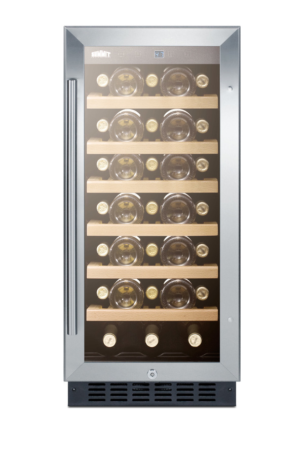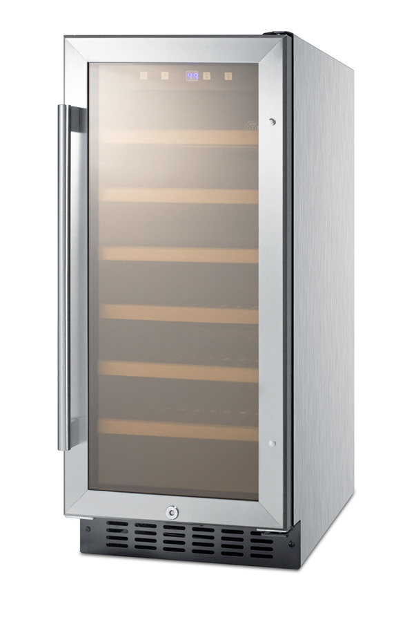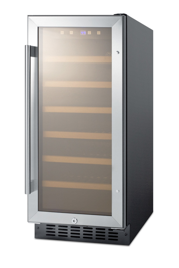 Give your wine collection the proper care with SUMMIT SWC1535B, a slim-fitting wine cellar designed for built-in use under counters. At just 14 ¾" wide, the SWC1535B is thoughtfully sized to store up to 33 Bordeaux style bottles on six slide-out wooden shelves (if using this unit for wider Burgundy style bottles, you can remove every other shelf to accommodate their size). An interior LED light provides an elegant view behind a tempered glass door, elegantly trimmed in stainless steel. The reversible door includes a factory installed lock and professional handle. Inside, the digital thermostat makes temperature management easy and intuitive, with indicator lights to show when the interior is ideal for reds, whites, and sparkling wines. The SWC1535B has a jet black cabinet and flush back design for easy installation under any counter. The unit can be used built-in or freestanding. For a matching glass door beverage refrigerator, see the SCR1536B. This model replaces SUMMIT SWC1535.